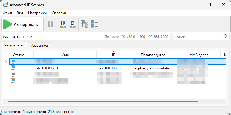 2. Запускаем программу Advanced IP Scanner для поиска в сети IP Raspberry Pi