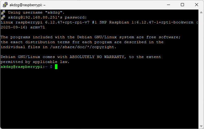 6. Заполняем Имя хоста (у меня 192.168.88.251). Порт 22. Имя пользователя (у меня akdzg) и Пароль, которые задавали на этапе подготовки образа.