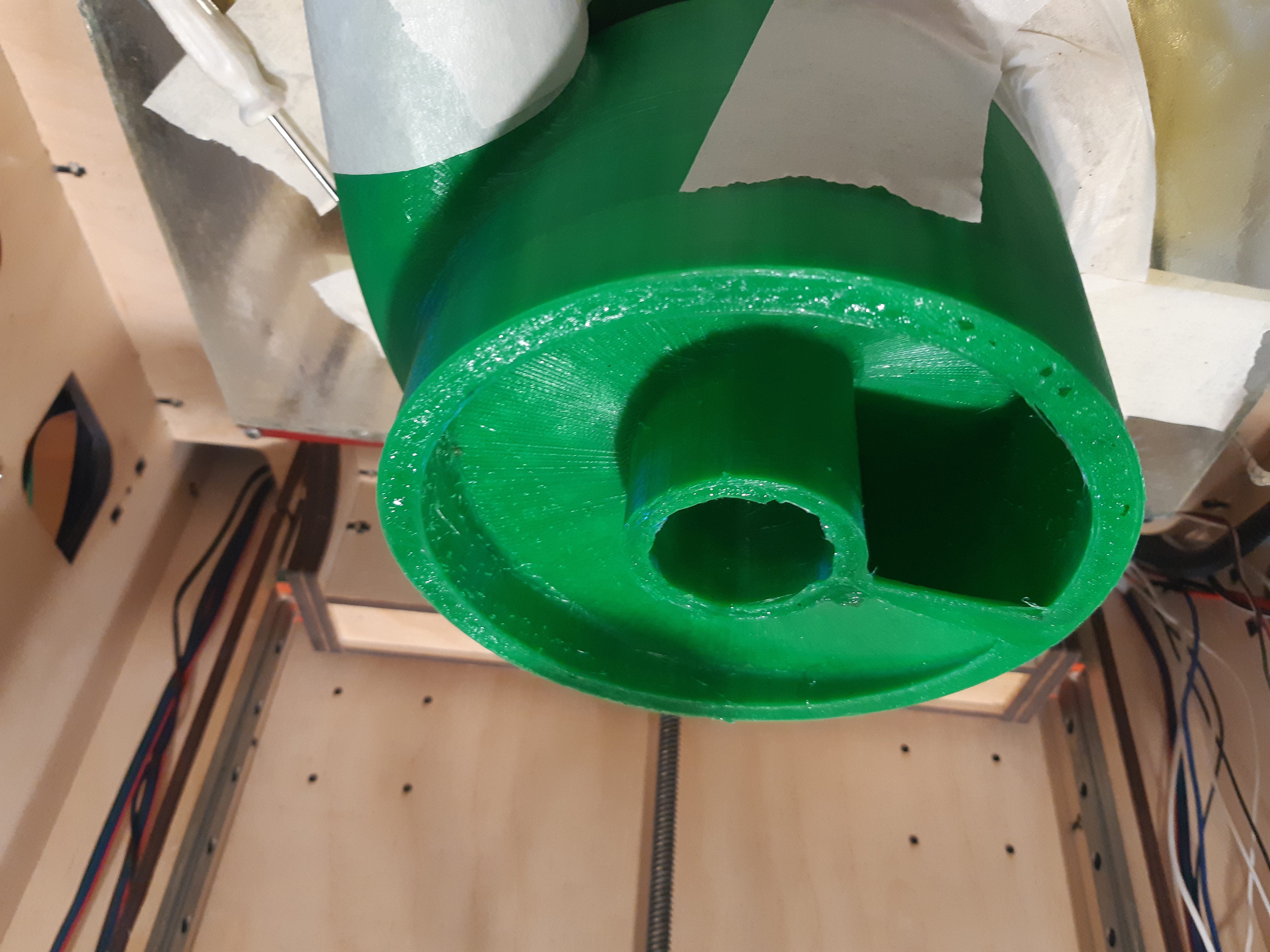 Это пет-джи, скотч для страховки, т.к. вытаскивал принтер из угла, чтобы перебрать хотэнд. Там где легли новые слои проблем с межслойным не вижу, пчатал 2 слоя вмазывая пластик в деталь на скорости 6мм, на глаз шов выглядит очень крепко, хоть и неаккуратно. А вот перед швом пара см с очевидной недоэ...