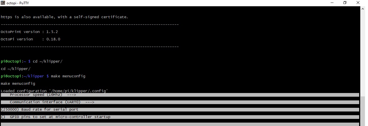Установил MobaXterm, с ней меню в нормальном виде. Прошивку скомпилировал, теперь нужно подружить klipper с платой принтера.