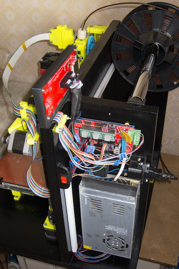 Провода от двигателей Z сразу уходят в отверстия за ними. Белый - кабельканал. Чёрные детальки напечатаны из PLA на 3D принтере. Поверх RAMPS рекомендуется установить вентилятор с низкими оборотами. На все провода цепляйте бирки с подписью - в будущем будет проще разобраться