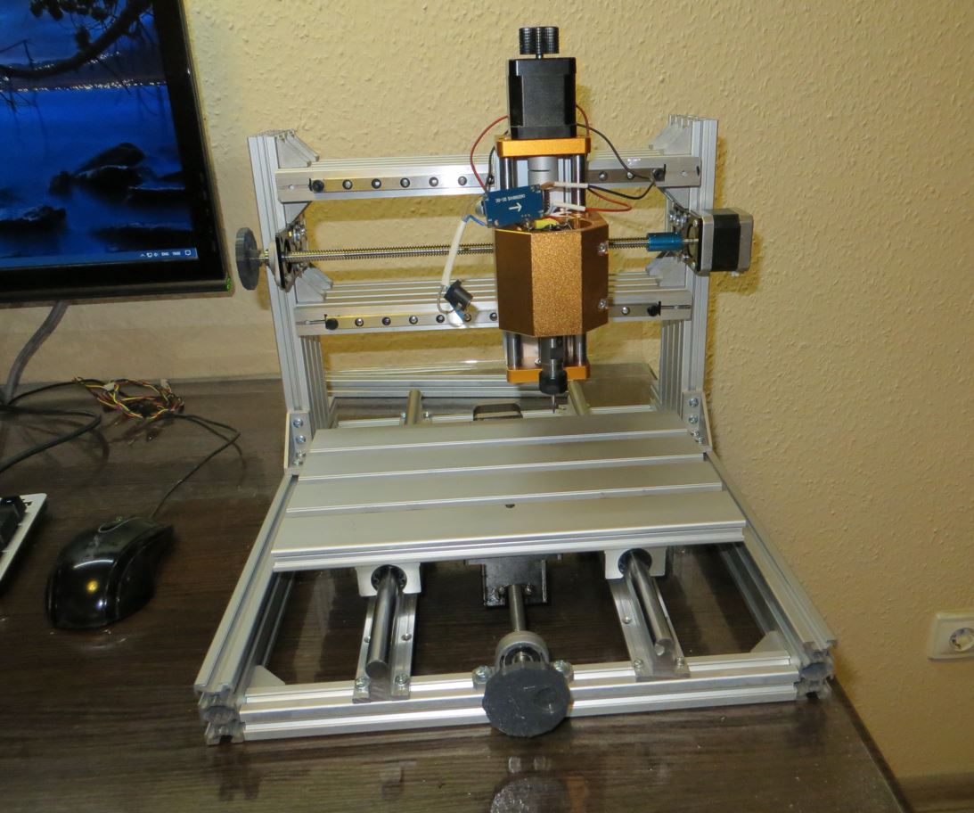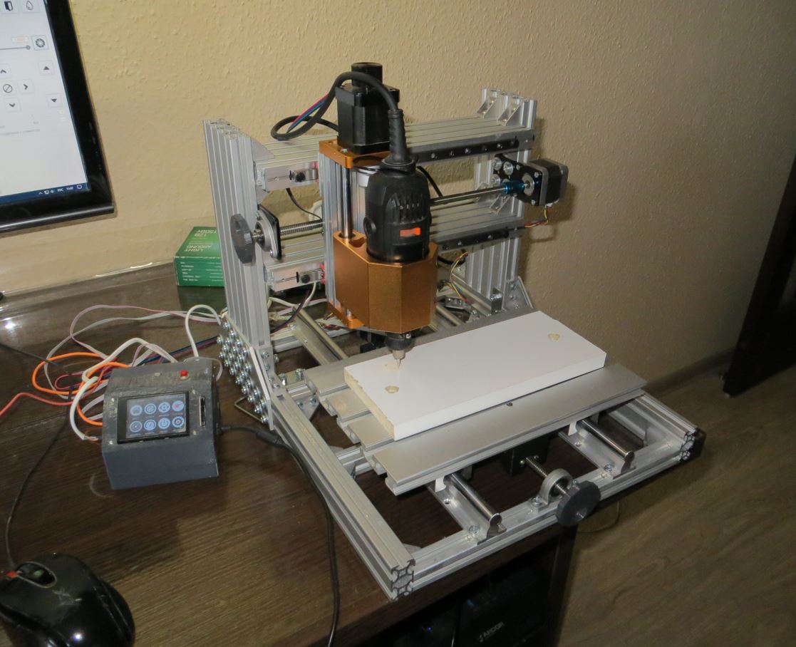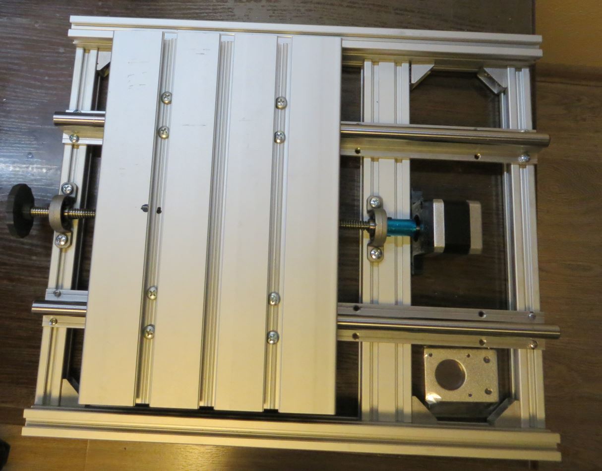 Зона фрезеровки фрезера - 210 мм на 180 мм, высота 50 мм, но может быть расширена. Рама 300 мм на 40 мм.... Тип - с подвижным столом - "Дрыгостол". Увеличивать размеры смысла нет - время фрезеровки плат - несколько часов для максимального размера..... Маленькую плату около часа фрезерует.