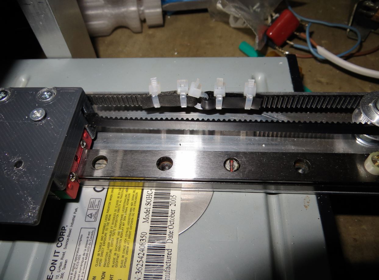 Придумался новый способ натяжки ремня. У меня не хватало ремней для Х и У осей. поэтому для одной оси, которую потом не видно будет сделал их двух обрезков - и совершенно случайно получился новый способ натяжки ремней, крайне простой и очень дешёвый - пять пластиковых стяжек. Был бы цельный ремень - натянул бы ремень с помощью одной только стяжки внутри каретки. А так вполне практично получилось и два обрезка ремней пристроил.