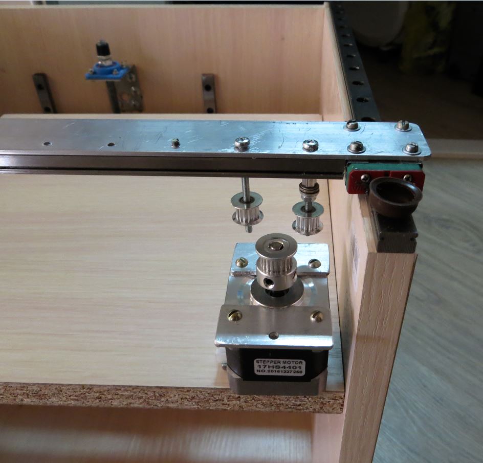 Блин внутренняя жаба давит - конструкторская дилемма. Если идти по проекту , который взял за основу -ремни внутри корпуса и ниже балки, а двигатели на стенках корпуса по бокам - то по оси Х вместо 34 см расстояния между крайними положениями сопла получаем 29 см. (по У почему то получилось 25см всего, по Z тоже 28 см, но тут рельсы всего 30 см, а не 40 см как по XY ). Можно уйти на два других конструктива -второй конструктив движки вне корпуса на задней стенке - тогда надо делать отверстие в задней стенке для пропуска ремней, а самое главное ремни буду спереди и их тогда надо закрывать верхней поперечиной(спереди сверху) -теряется весь смысл такого конструктива - тогда проще было делать всю кинематику на одном щите , а для рабочей зоны делать квадратный вырез.