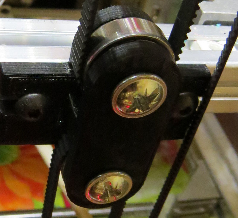 Совсем забыл одну вещь, которая может обьяснить почему полосы при печати с ремнем более явно выражены чем на кубиках с трапецией (воблинг во внимание не берем). Дело в том что первоначально в углах рамы по XY ремень скользил по обычным круглым подшипниках, но для этого его (ремень) нужно было перекрутить, чтобы ровной стороной ложился на подшипники. Эта схема была в оригинальном HyperCube, чтобы ремень не перекручивать нужно в углах ставить шпули с зубами внутри которых подшипники поменьше, это схема HyperCube Evolution, собственно за несколько дней до переезда на ремень я так сделал. Наверное стоит перепечатать угловое крепление под более крупные подшипники и снова применить вариант с перекрученым ремнем.