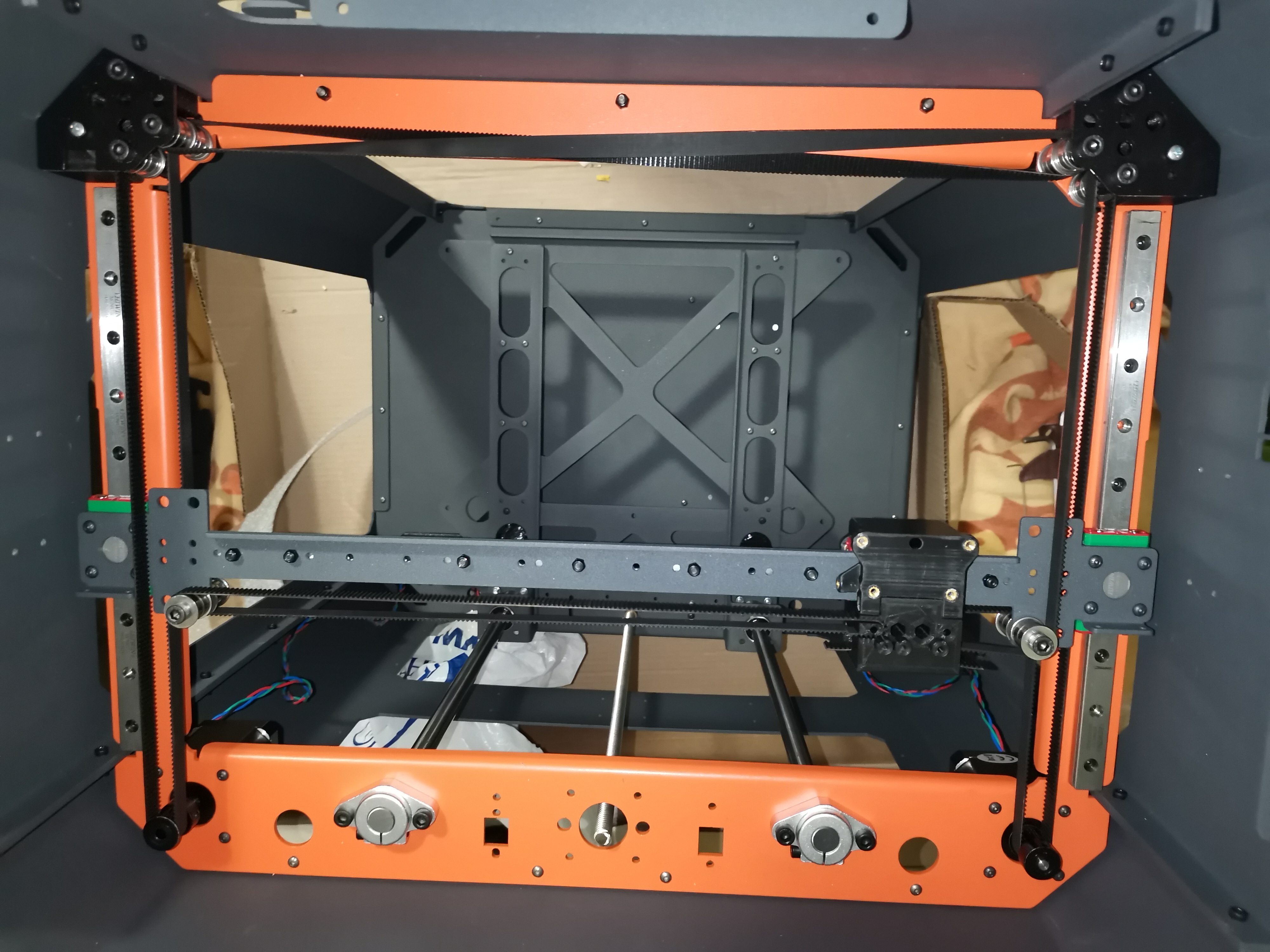Стало мне недоставать области печати Мити, а особенности дельта кинематики предполагают собой масштабирование в разрезе диаметра, но вот места в моей мастерской оказалось только 480*380 - дельта подходящая никак не лезет. Два принтера мне тоже ни к чему, поэтому дельта либо на продажу, либо на запчасти. Продать любимый станок за бесценок я не захотел, поэтому было принято решение пустить его на органы. Из органов самыми ценными показались 12-е хивиновские рельсы и моск Дует2 вифи. В общем, выбор кузова упирался в доступное место для станка + 12 рельсы. Конкурса не было - под запросы прокатил только B&R 3020plus. Покупка и доставка прошли гладко - респект Борису. Корпус имеет несколько врожденных дефектов - кривоватый портал и днище. Как я понимаю, издержки технологии изготовления - я предполагал это, и рихтанул почти на коленке. Пока не могу результаты предъявить - сборка в прогрессе. Новичкам эту тему не могу рекомендовать - корпус универсальный, и неофит запросто запарится. Я, как типа бывалый, представлял чего хочу от станка: область печати 3020, рельсы 12-е, директ, к таким рельсам и деректу просится Кора на 9 ремнях. Короче помесь бэхи и УАЗика)