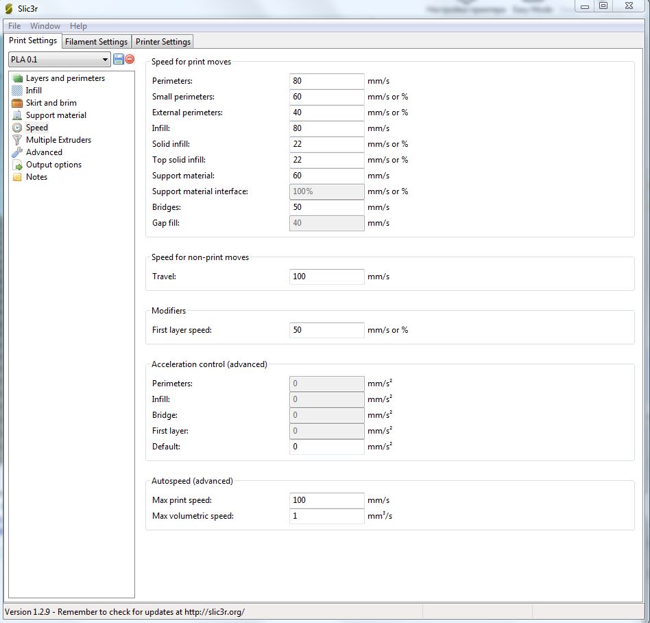 Параметры слайсера Clic3r Repetier-Host V2.0.1