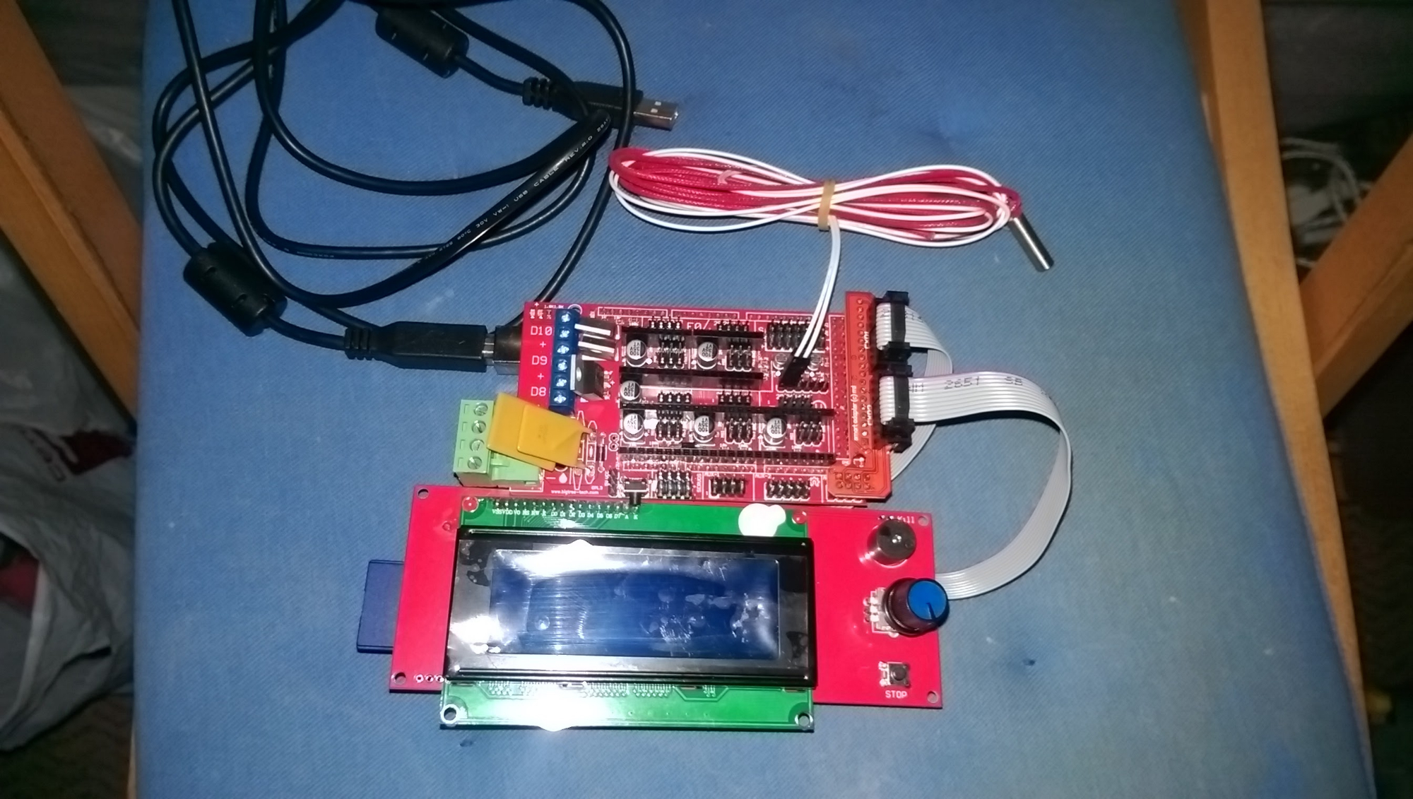 Собрал бутерброд из Меги и РАМПСа, подключил дисплей, терморезистор хотенда, залил прошивку.