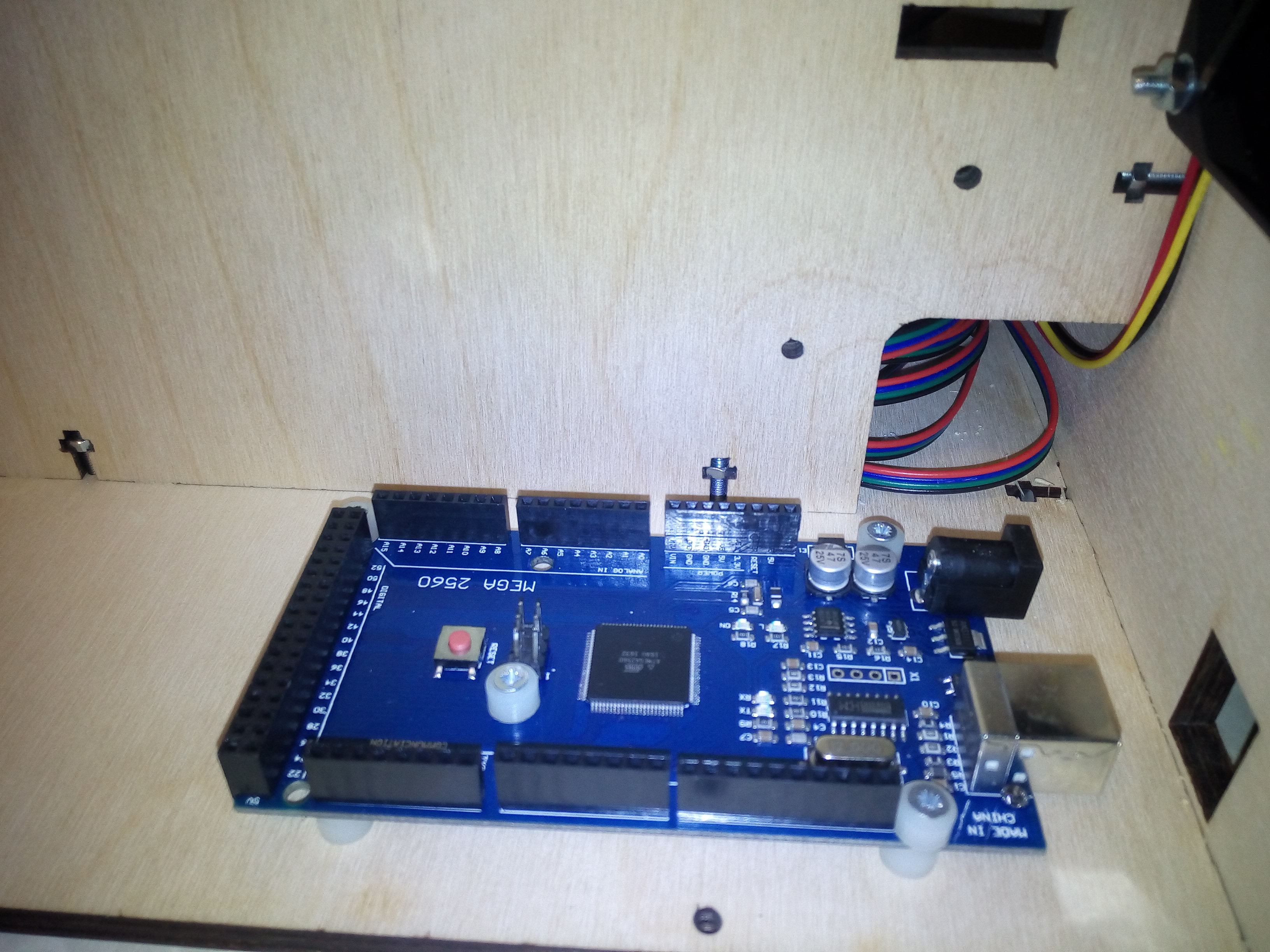 Начал с того что как кажется умею- закрепить мегу на корпусе. Это хорошо, что мерить мегу стал с уже установленным рампсом, ведь вышло так что либо резет рампса упирается в пол принтера (наверняка нанимается кнопка), либо провод юсб для разъёма меги не пролезает в гнездо, под него вырезанное. Уф. Нашёл положение что все должно залезть. Мегу поставил на пластиковые втулки, такие же сверху под шляпку шурупа добавил- и изоляция, и длинный шуруп теперь не выйдет снаружи корпуса.