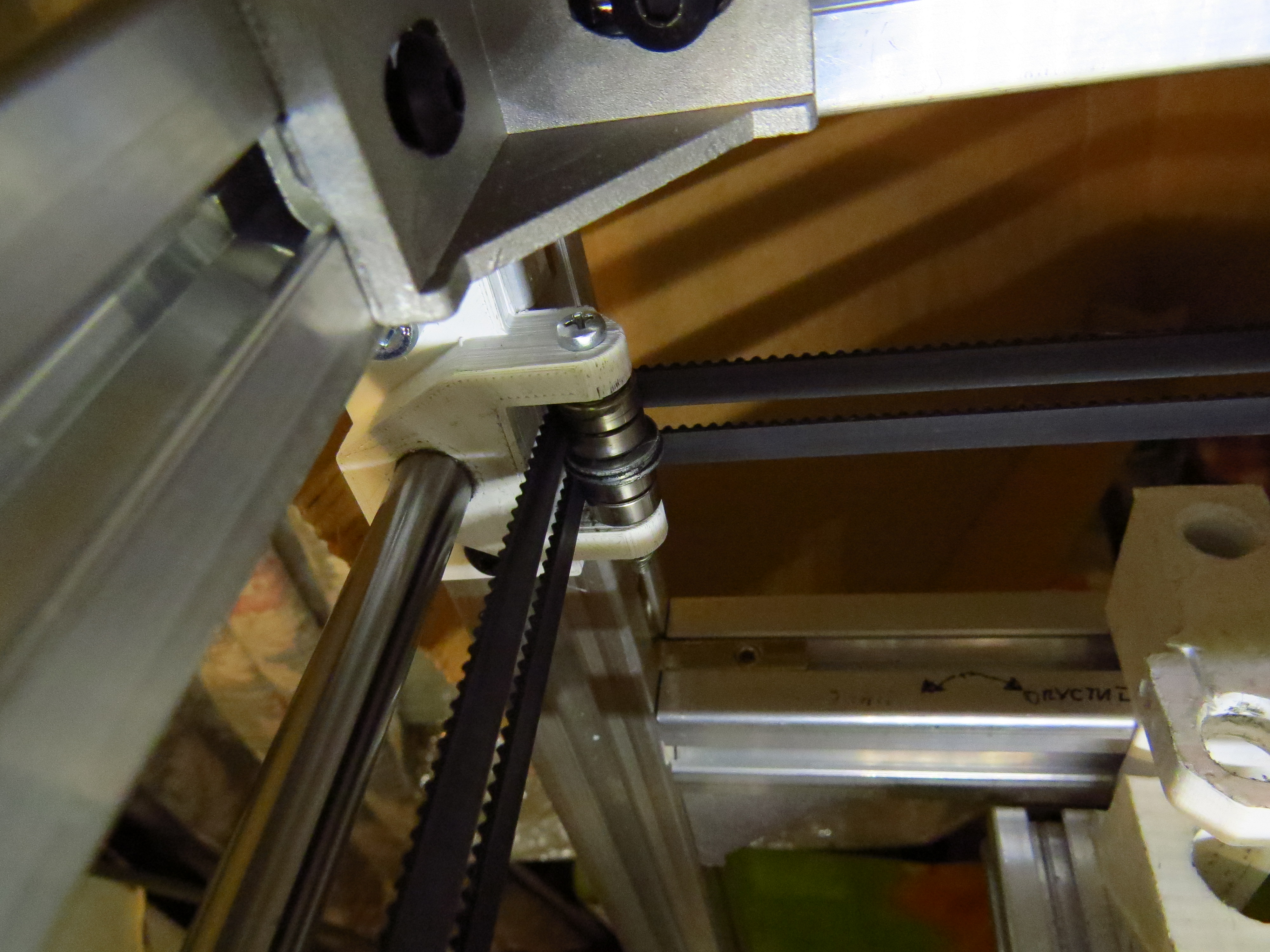 Обратил внимание что кронштейны, в которых зафиксирован вал, при движении стола изгибаются, они имеют вынос точки крепления вала, и эта точка вместе с точкой крепления к профилю образуют плечо, примерно 15 мм, под нагрузкой этого достаточно чтобы при подъёме вверх врерхние точки крепления сходились а нижние расходились и наоборот при движении вниз. Для подшипников LMUU такие качающиеся валы - зло, что приводит к закусываниям и полосам на стенках детали. Так что все 4 точки крепления валов буду менять на металлические опоры типа LK12.
