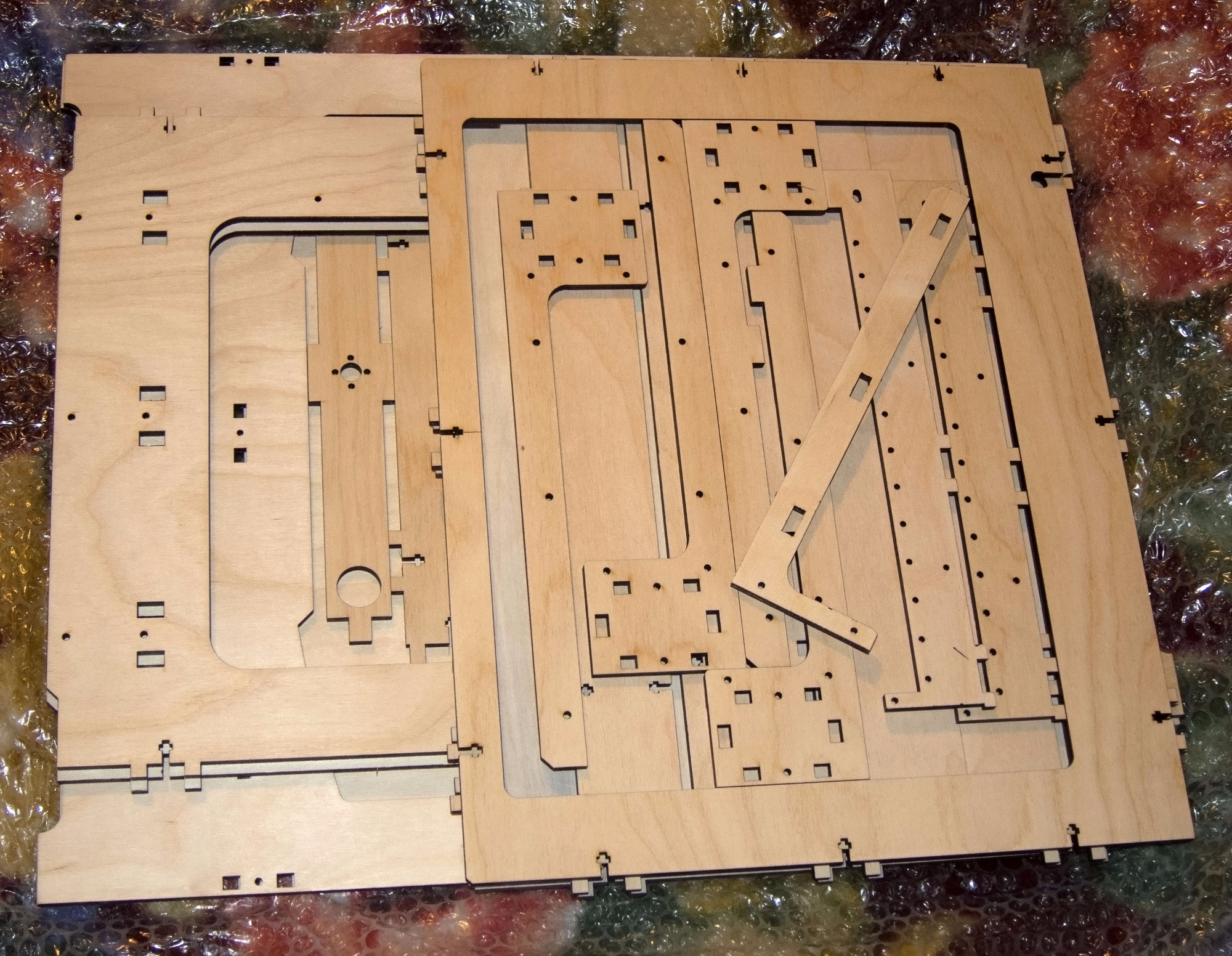 Ещё желательно очищать все детали мягкой, сухой кистью от древесной пыли. Потому что все детали после резки обрабатываются шлифмашинкой и продуваются сжатым воздухом, но пыль от мелкой шкурки всё же остаётся в волокнах фанеры.