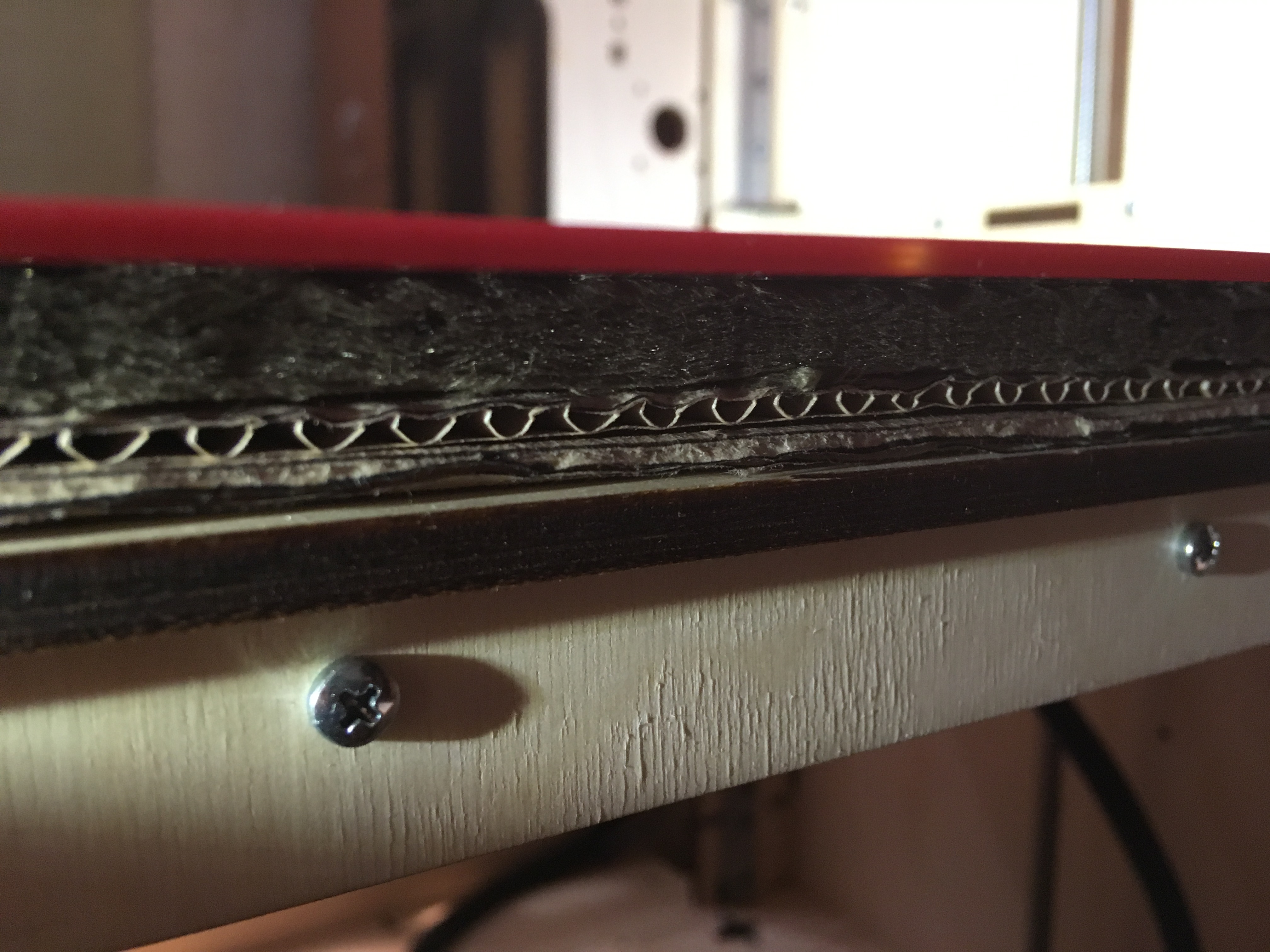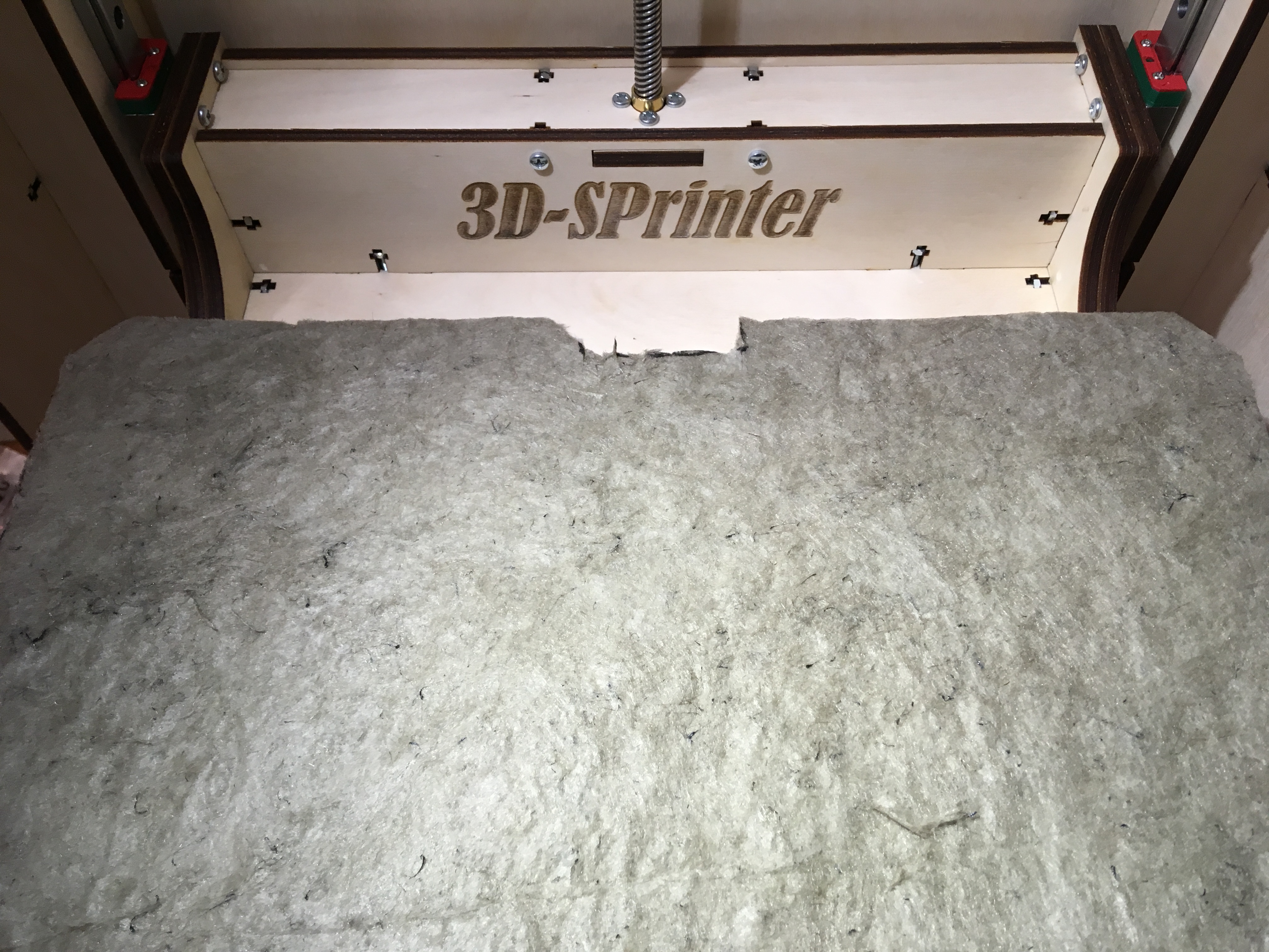 Базальтовый картон оказался материалом так себе. Во-первых, он плотный и тонкий(6мм), большой диапазон регулировки не даёт, т.к. слабо сжимается. Во-вторых, с него сыпется каменные иголки, волосы и пыль. Большую часть мусора я смахнул и стряс с него, но все равно внизу мусор от него ссыпается. Пока подложил под него гофрокартона лист. Надо, видимо искать мягкий базальтовый ватник 10мм толщиной. Интересно, с него так же будет сыпаться?