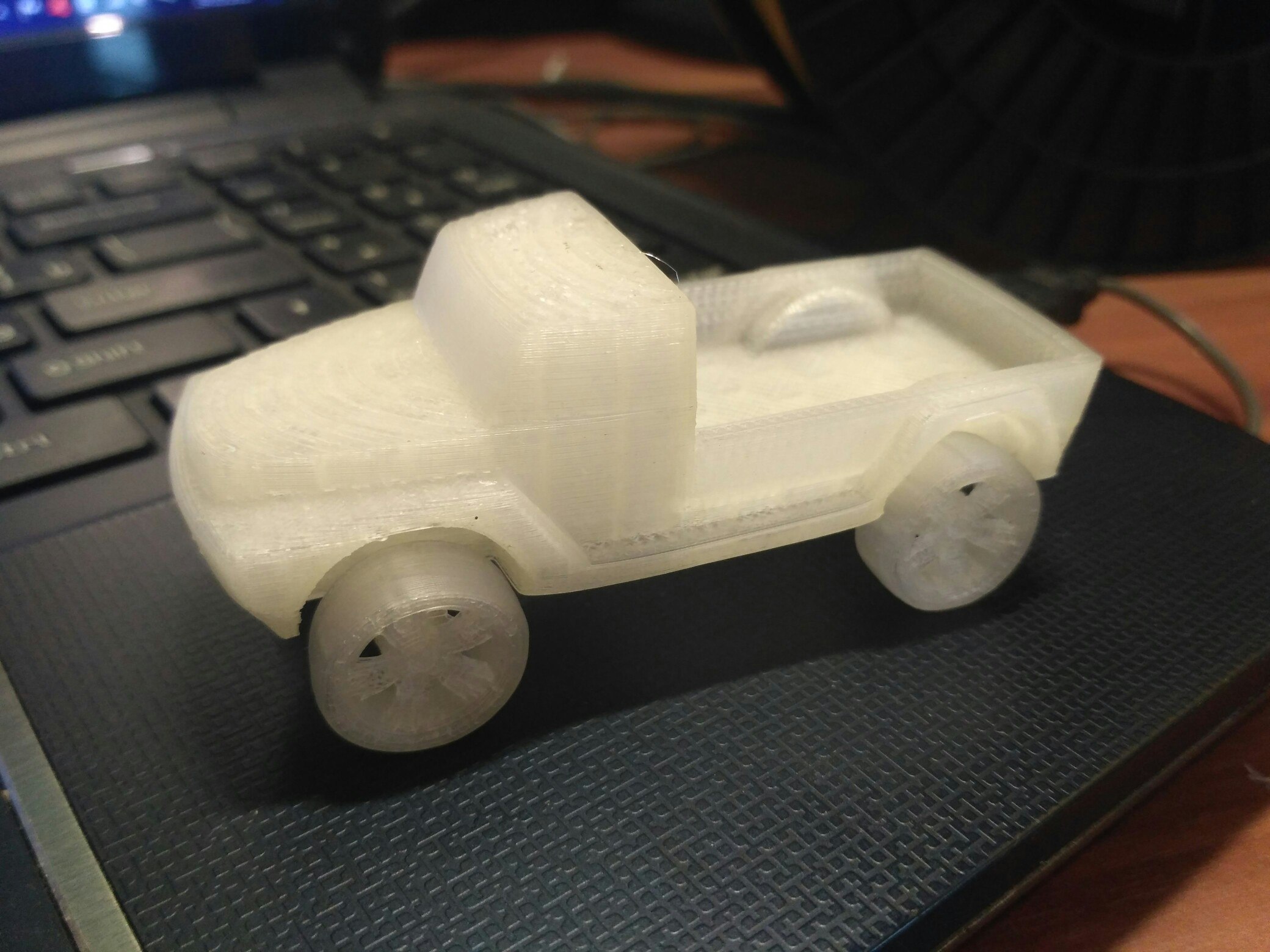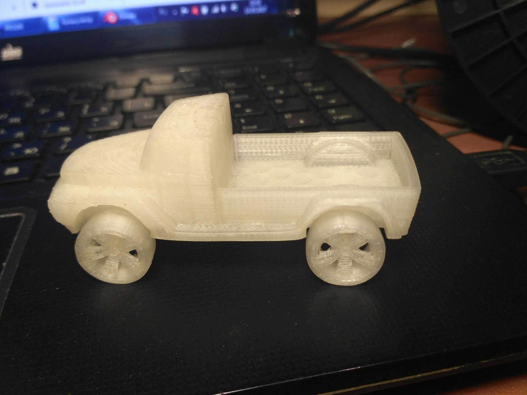 Также попробовал натуральный ПЛА от ФД пласт. Слой 0,2 температура 210/75, для сопла достаточно 200, при 210 идет перегрев на узких участках. Колеса и кузов печатались отдельно.
