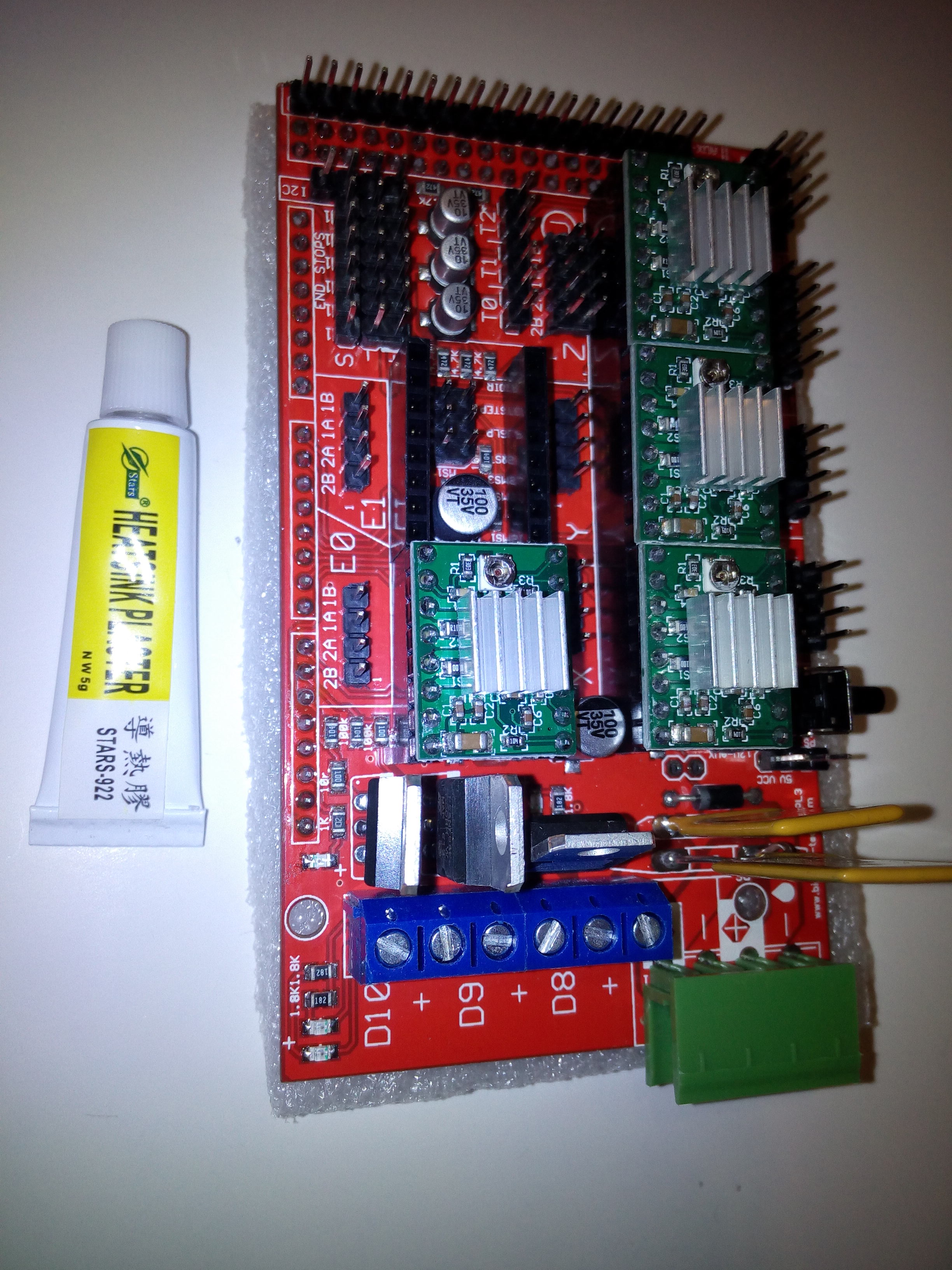 На кетайских :arduino Mega 2560 СН340, Ramps1.4, А4988, с БП 12В 30А, и реле на стол.