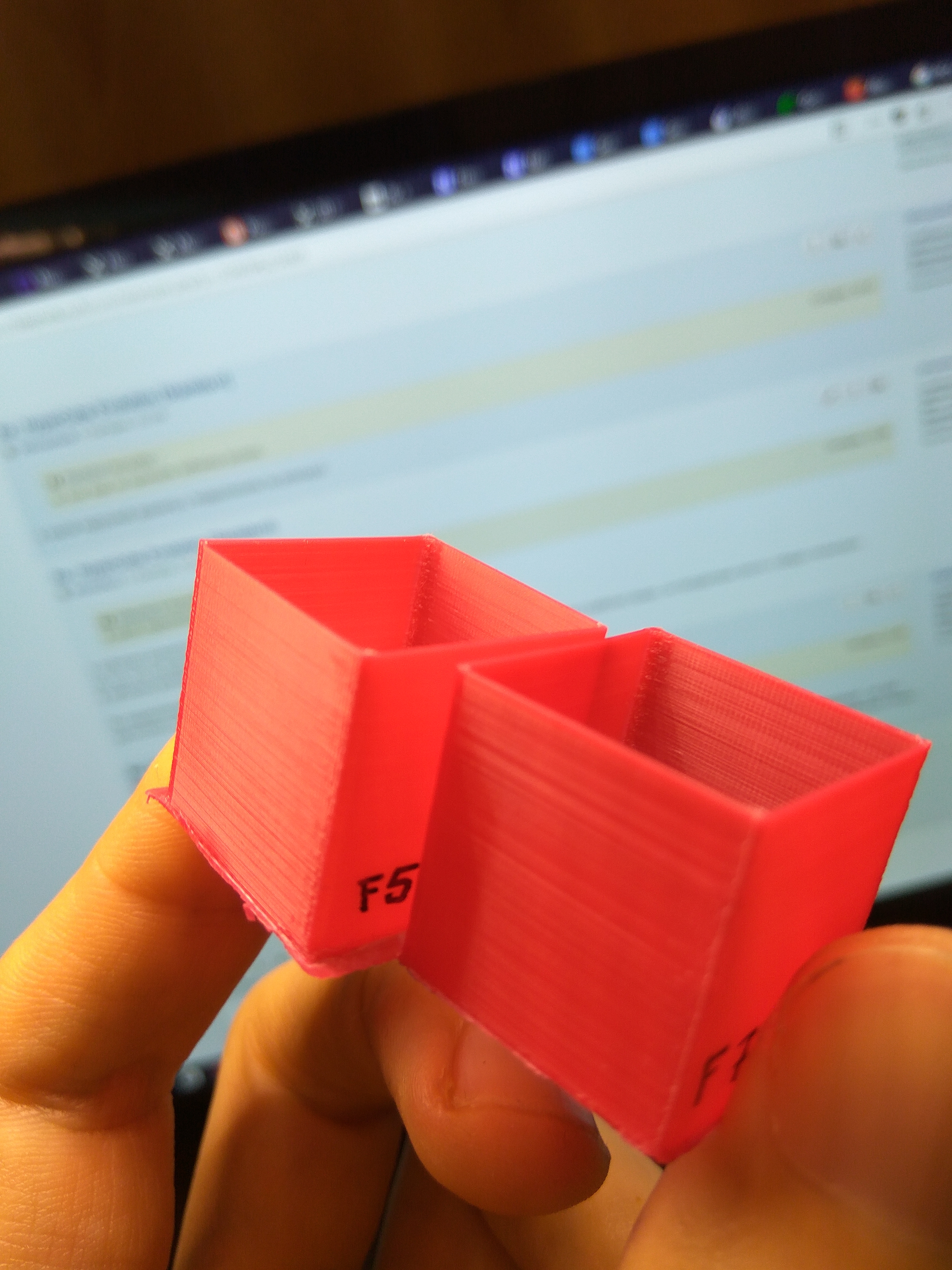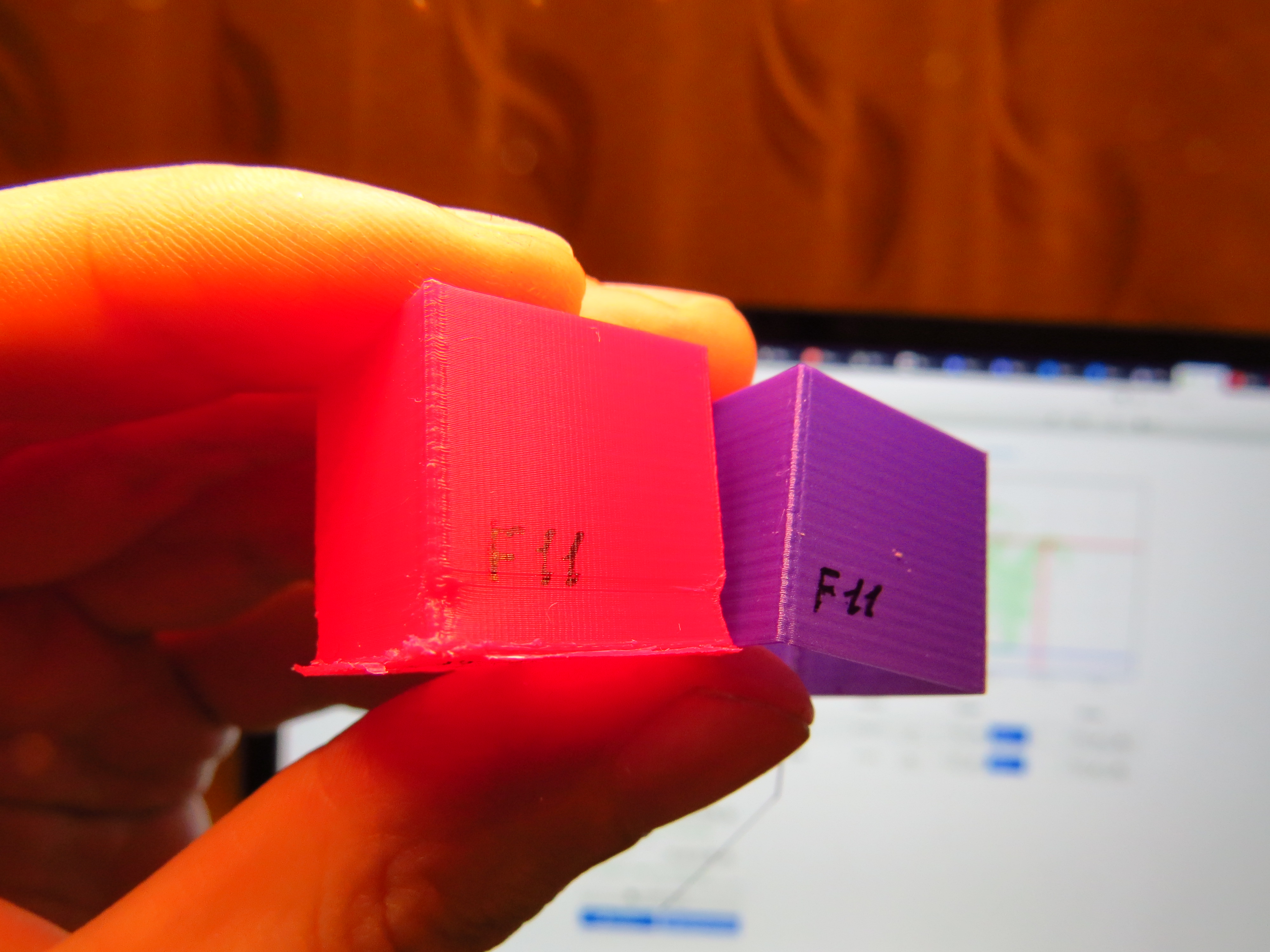 Результат - отпечатки серии F11, красный - АБС, Фиолетовый металлик - ПЛА. Можно с уверенностью говорить, что амплитуда вибраций заметно упала, теперь чтобы увидеть волны на тестовом кубике нужно ловить тени, крутить кубик на свету. Эффект случайных полос так же присутствует но не сильно выражен. Так же можно заметить вертикальную ряб, если поймать положение кубика, то ряб эта видна отчетливо, и это есть хорошо, так как заглубления ряби может пара десяток микрон или меньше и чтобы ее рассмотреть стенка кубика должна быть ровной.