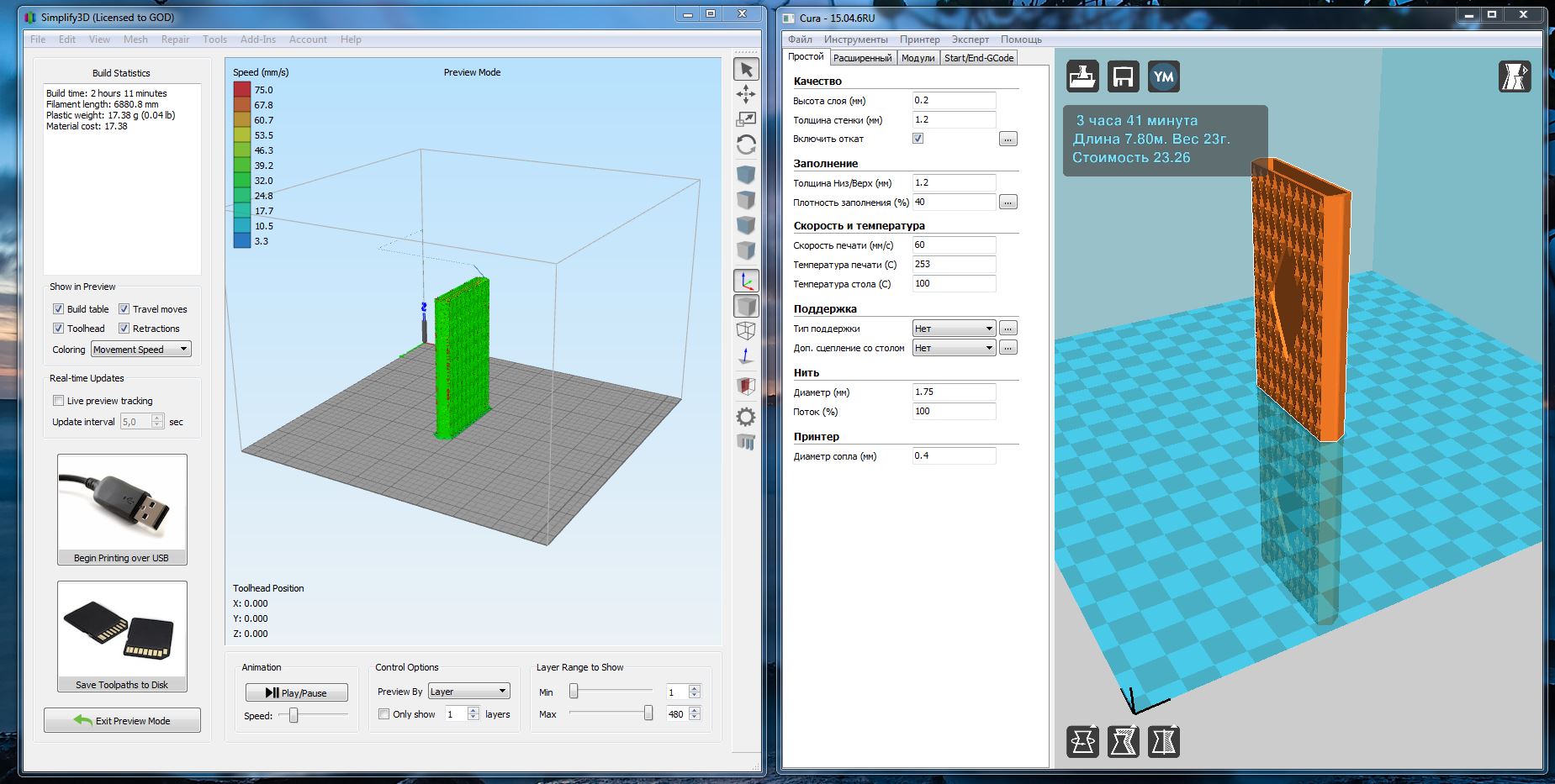 Правда с SIMPLIFY3D почти полдня бился пока отстроил нормально (до этого программой не пользовался и работать с ней не умел). У меня сперва время печати было больше, чем на CURA - диаграмма скоростей показывала , что на стандартных настройках у меня печать - 10 мм/сек. и пока вывел хотя бы до 40 мм/сек в среднем по модели много времени потратил. А сегодня быстро открыл модель , чтобы прикинуть время печати в Куре, а потом просто решил посмотреть пару моментов в SIMPLIFY3D и ...... сильно удивился разнице во времени печати на одинаковых настройках.