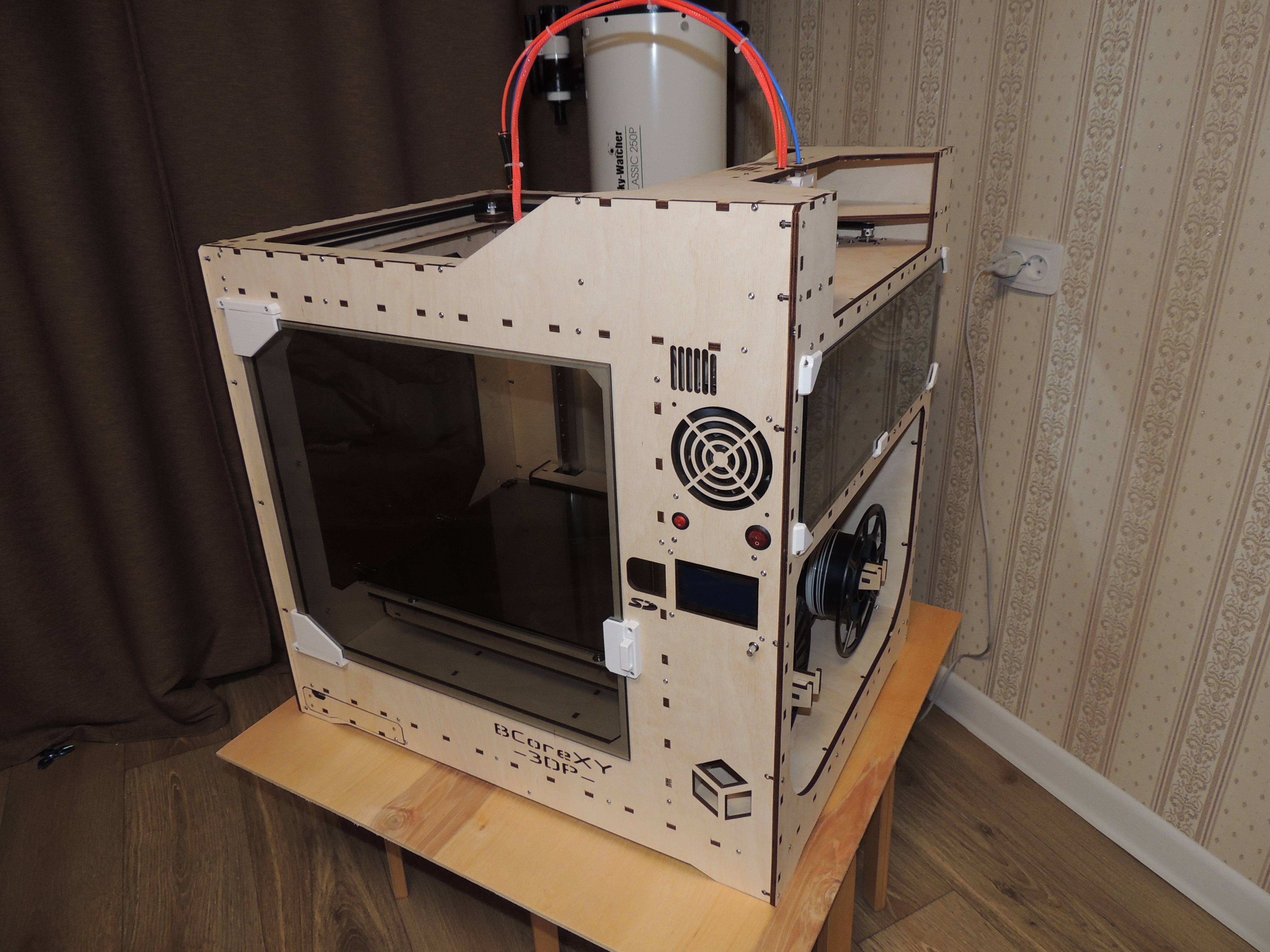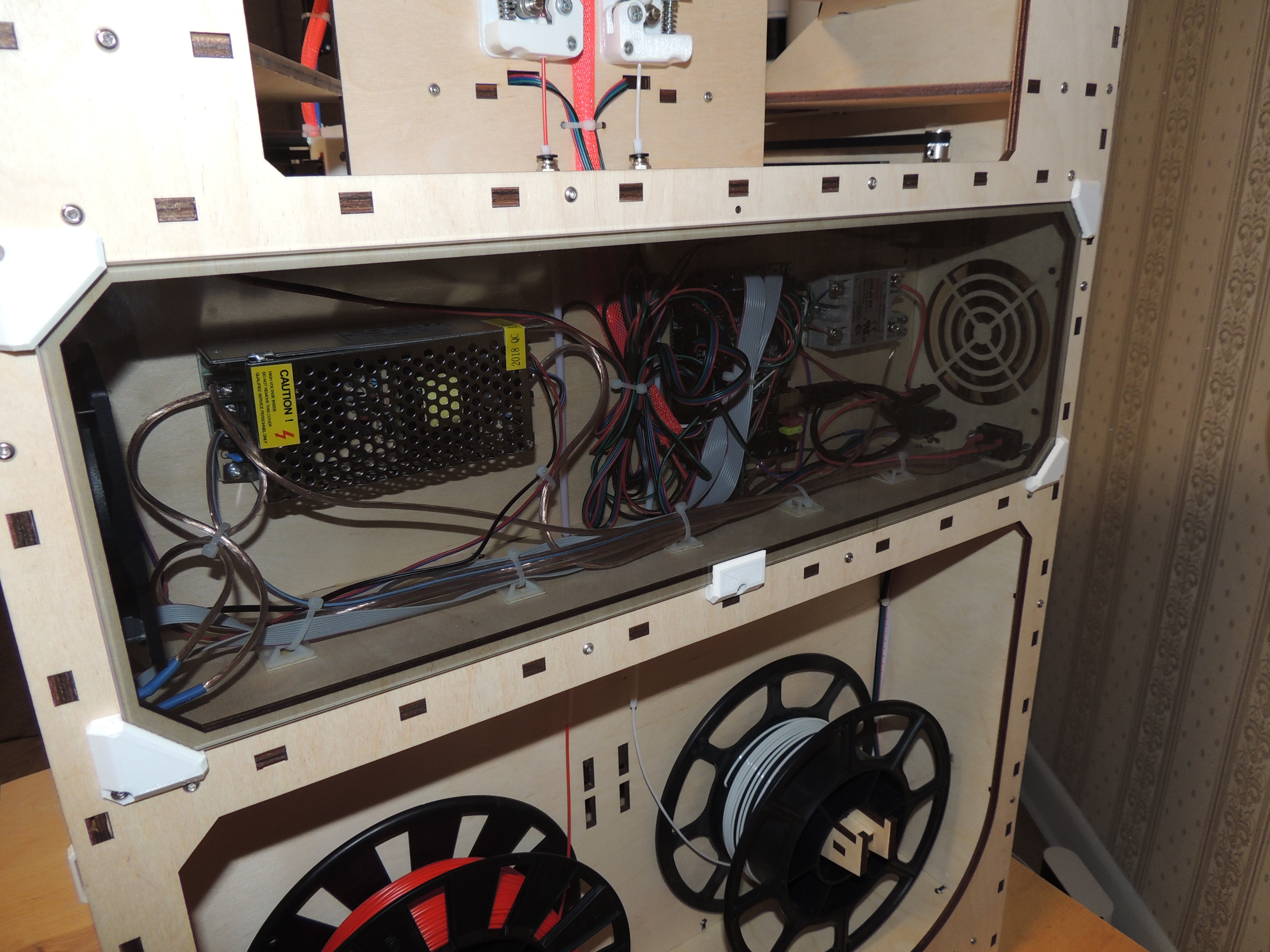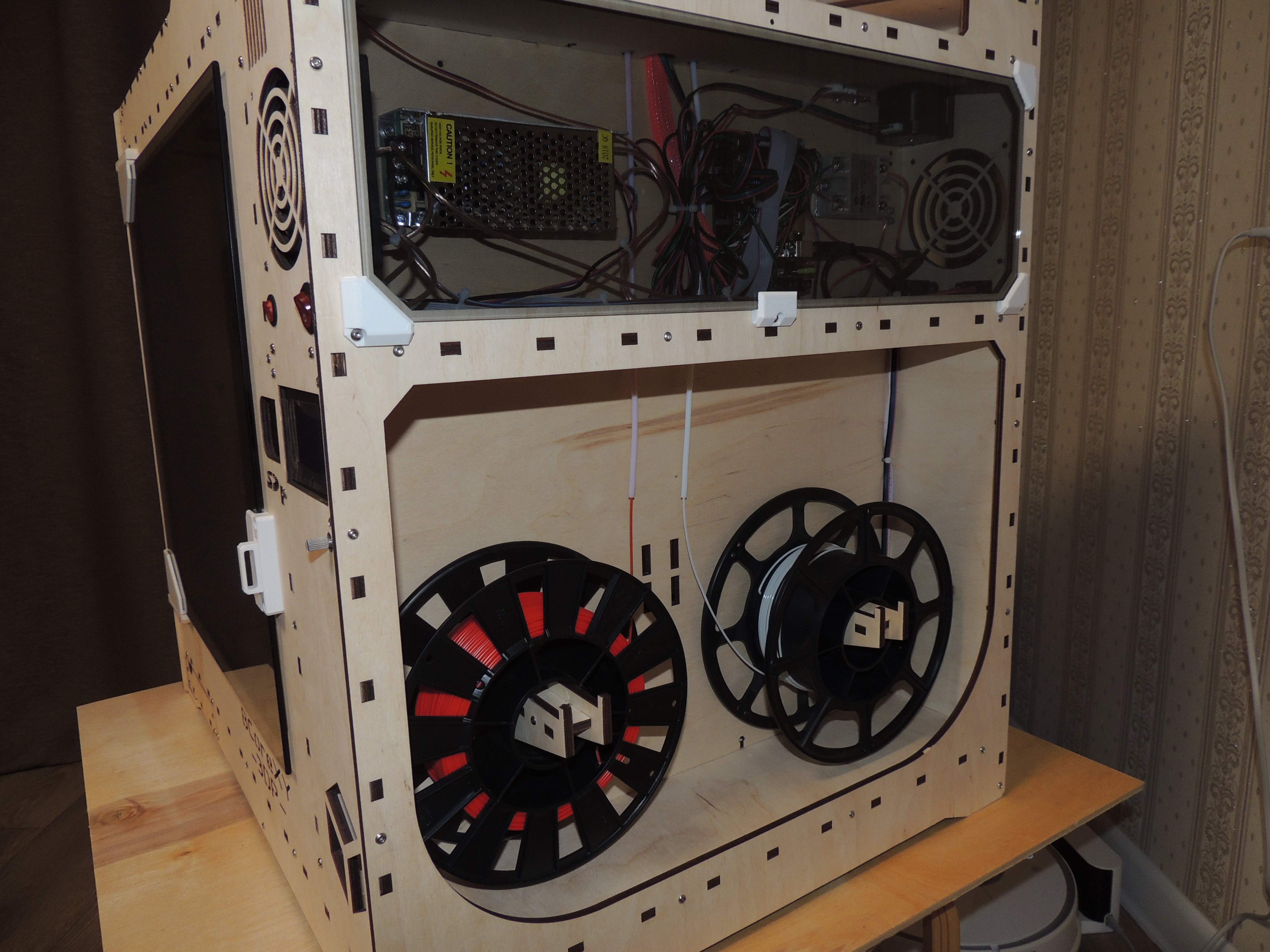До отсека электроники легко добраться, все на виду, достаточно открутить один болт и вынуть стекло. Внутрь помещается две катушки по 1кг пластика, как на фото, или одна 3кг по центру.