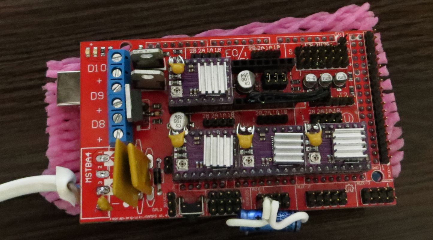 Добавил керамические конденсаторы на 4 мкф в питание драйверов - очень улучшают характеристики моторов, добавил электролит Филипс на питание 5 вольт, сделал на LM7805 - отдельное питание в блоке питания. Просто прикутил Лм-ку с двум конденсаторами с стенке блока питания и сделал вывод на +5 вольт - который одевается на любой пяти вольтовый вывод на рампсе. Один из драйверов - при не подсоединённом шаговом двигателе и при отсутствии командного сигнала греется в отличие от трех других. Но пока работает. Возможно долго не протянет. Визуально - плата у него чистая, ноги пропаял.