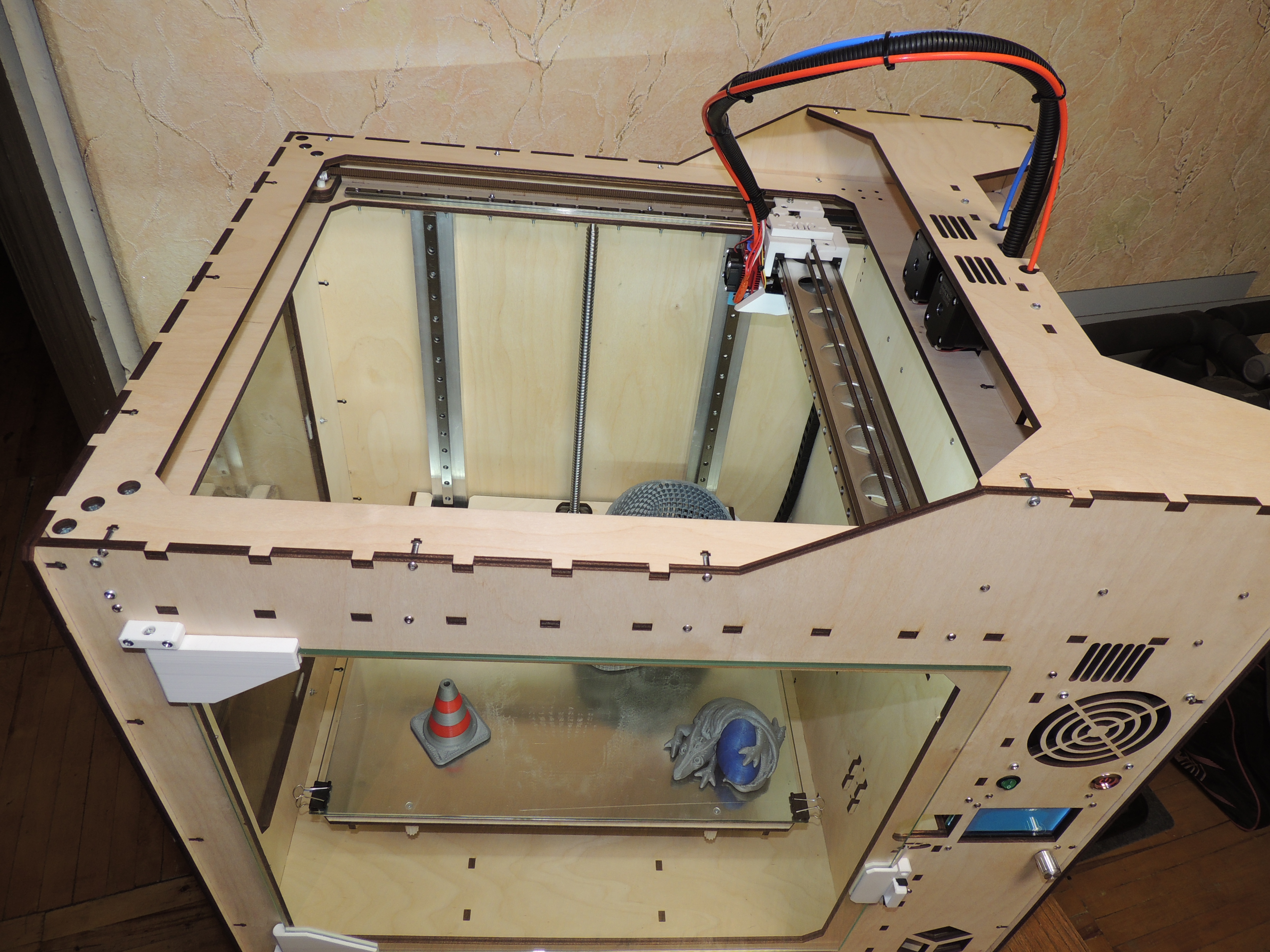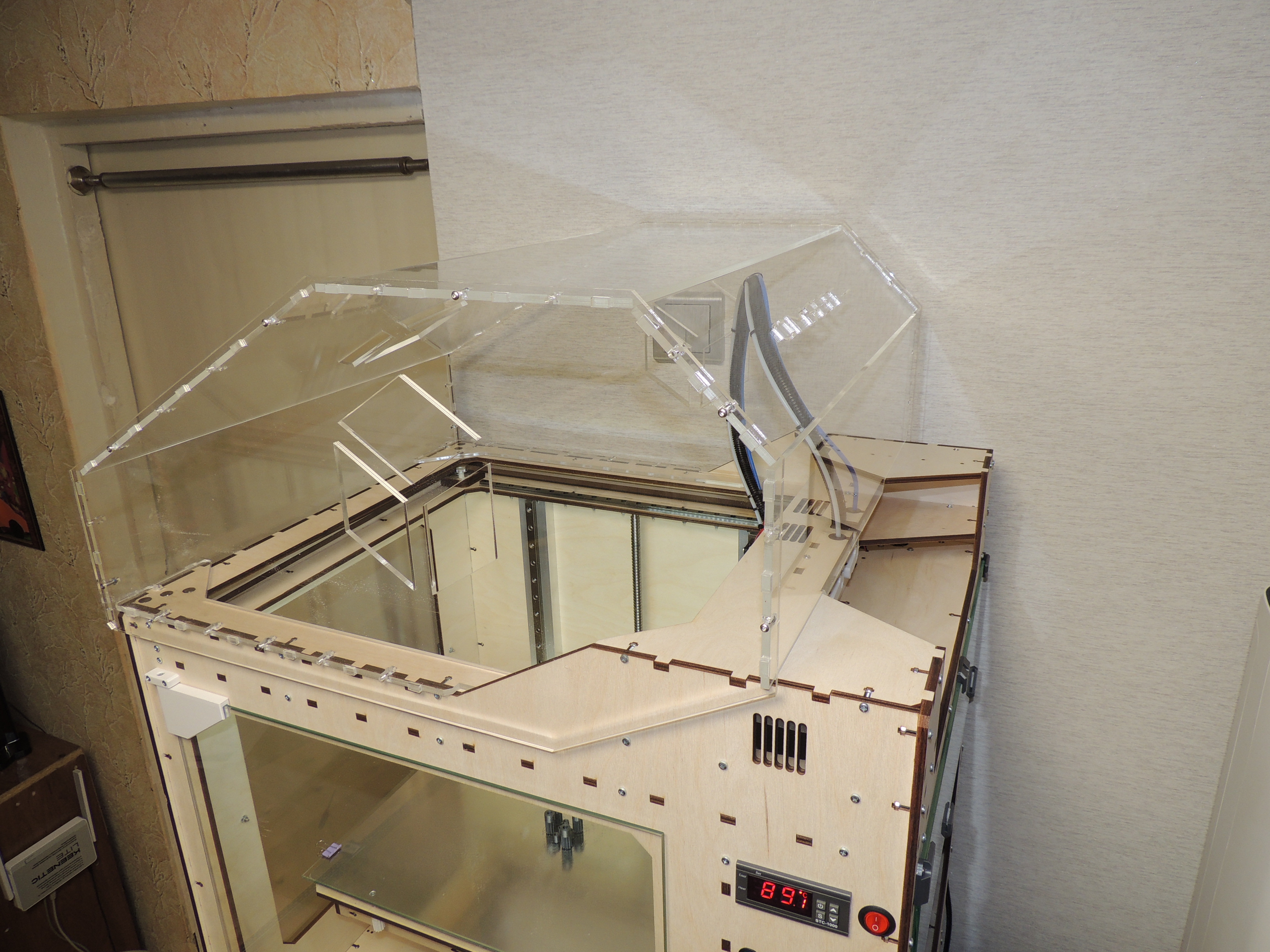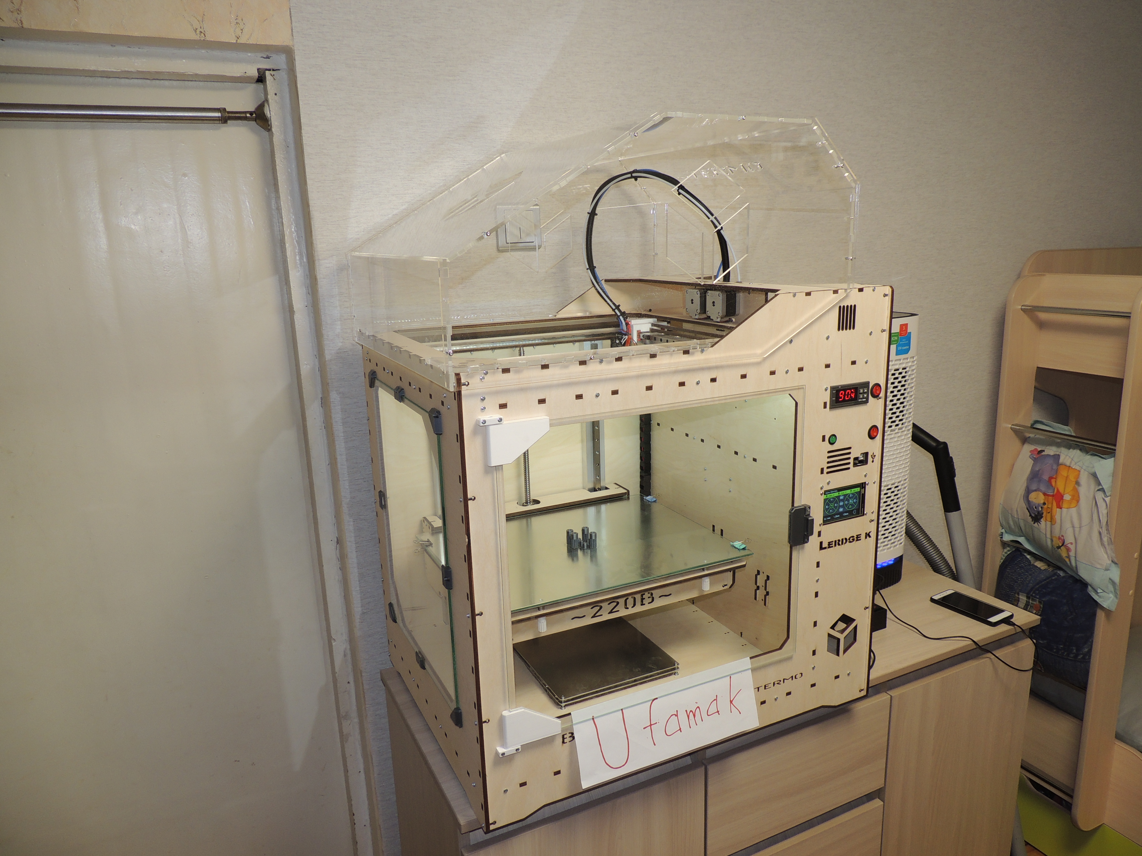 здравствуйте все) давно не писал. широкоформатные принтеры множат ряды) последнее творение - на электронике Lerdge K и с дополнительным обогревом рабочего объема + колпак из акрилового стекла для поддержания постоянной температуры. с обогревом было "сломано много копий", а именно источники и принцип нагрева. были перепробованы и галогенные лампы накаливания на 2кВт, и галогеновые источники нагрева аэрогрилей на 0,5кВт, и элементы нагрева от термофенов, и просто ТЭНы на 1кВт. все упиралось в пожаробезопасность для фанерного корпуса и электробезопасность для пользователя. компромисс был выбран - та же силиконовая грелка что используется для рабочего стола (сама грелка расположена между двумя алюминиевыми 2мм пластинами и 10мм слоем базальтовой теплоизоляции, вся конструкция отделена от принтера также 10мм базальтовой изоляцией). думаю что получилось и пожаро и электробезопасно. за нагревом следит отдельный контролер STC-1000 (на Марлин 2.0 в принципе можно повесить и на саму плату посредством реле, на Лердже никак). это для любителей АБС. мне как любителю ПЭТГ достаточно и колпака (и то чтоб пыль не собирал))) за сим дальнейшие улучшения данной платформы считаю излишними (их фактически нет))) и перехожу очень плавно к новому проекту - Принтер с ОООчень большой областью печати (правда низкорослой) для рекламщикоффф. велком в новую ветку. напоследок фото парочки последних Широкоформатников.
