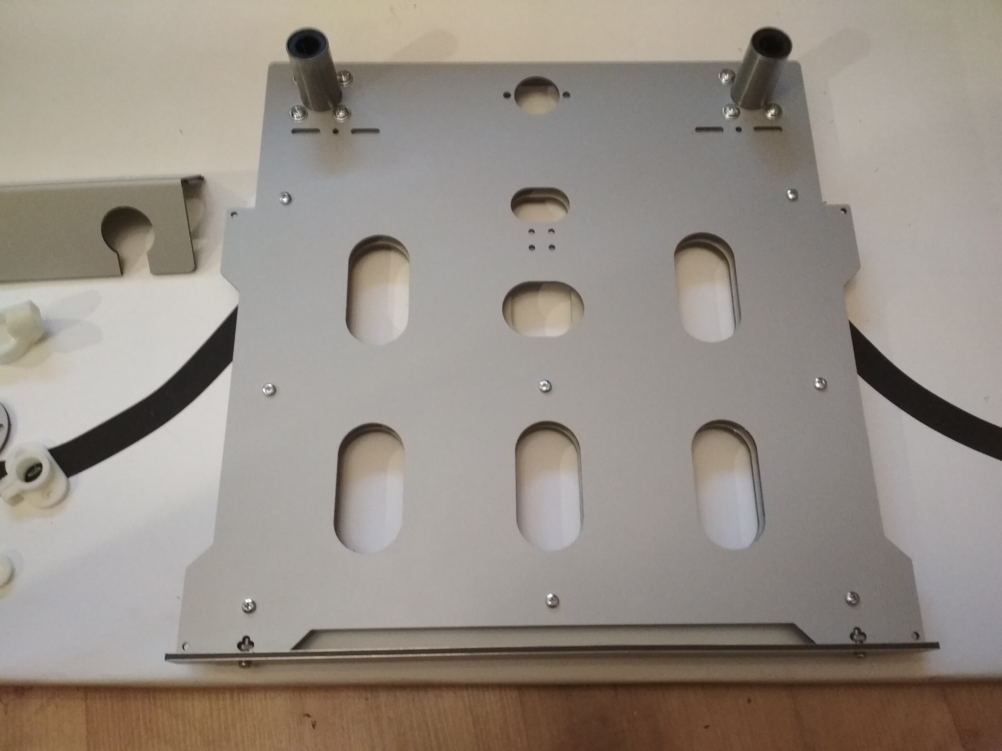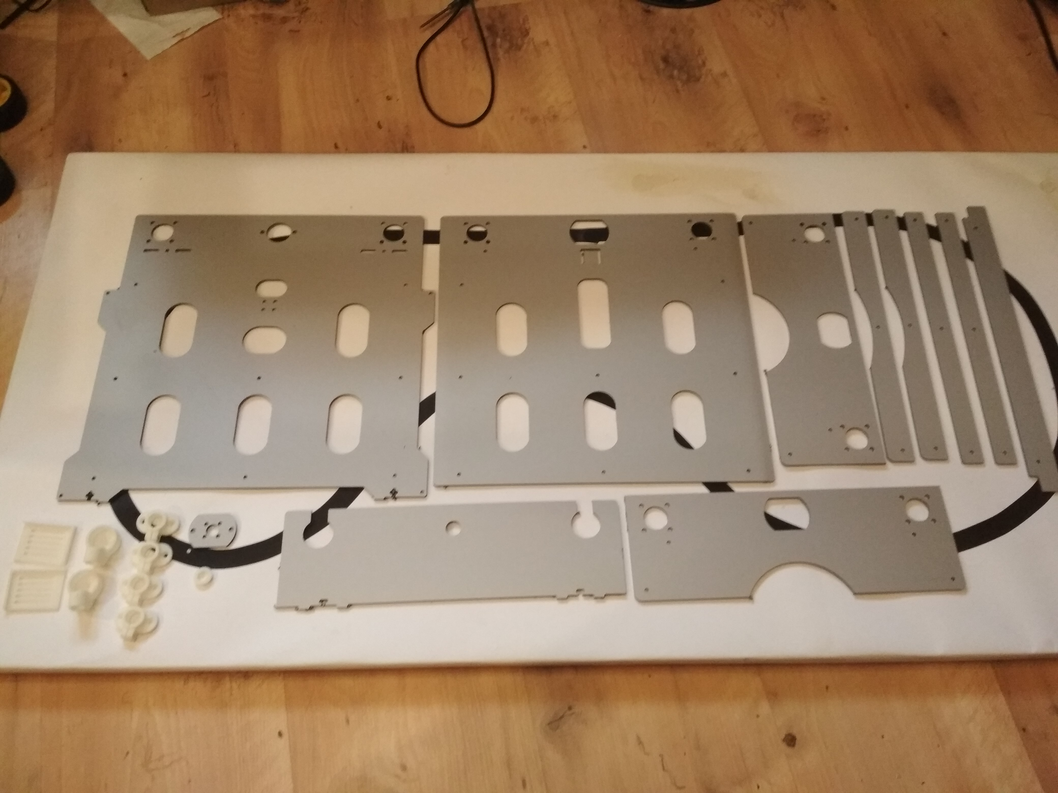 Все дело в том, что Андрей, автор Спринтера, любезно выслал мне для испытаний набор для апгрейда стола с фанеры на дибонд. Набор представляет собой небольшую кучку деталей, фрезерованных из 3мм дибонда. Кроме этого, Андрей положил мне все пластмасски, которые нужны для установки стола (хотя я их мог вполне распечатать и сам). И еще дополнительно - кусок пресловутого коврика из базальтовой ваты, который так хорошо подходит на роль утеплителя. За это отдельное спасибо, поскольку чего то подобного в наших краях не достать.