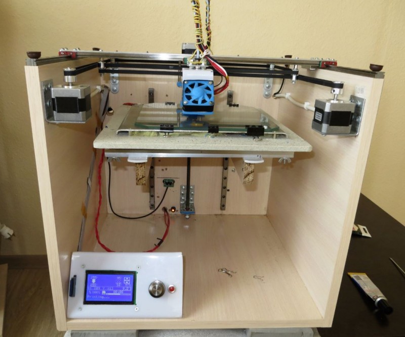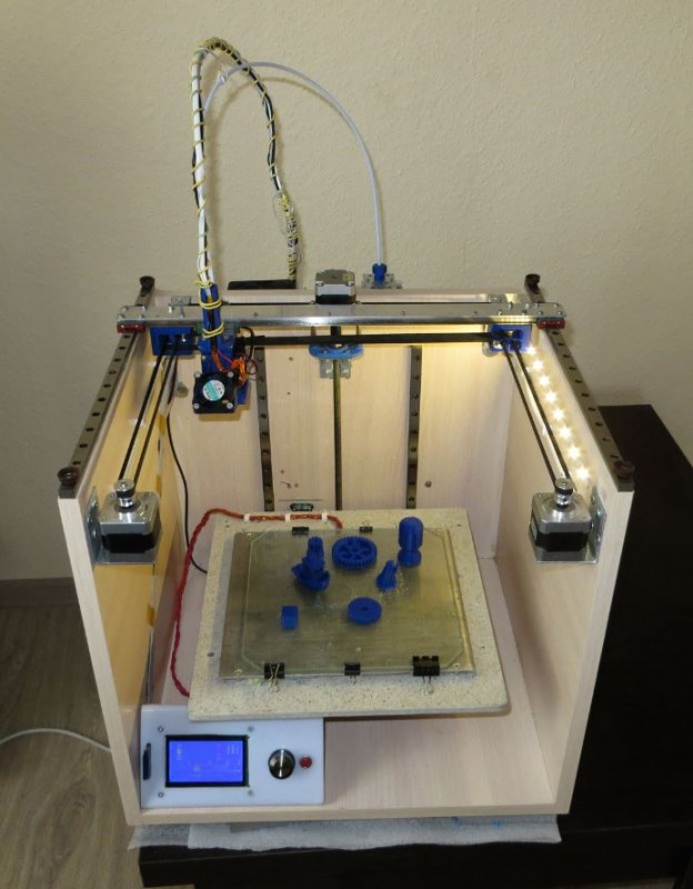 Корпус собран из ЛДСП. На начальном этапе можно обойтись без пластиковых деталей, напечатанных на 3D-принтере. А после сборки допечатать , то, что нужно и пересобрать узлы.