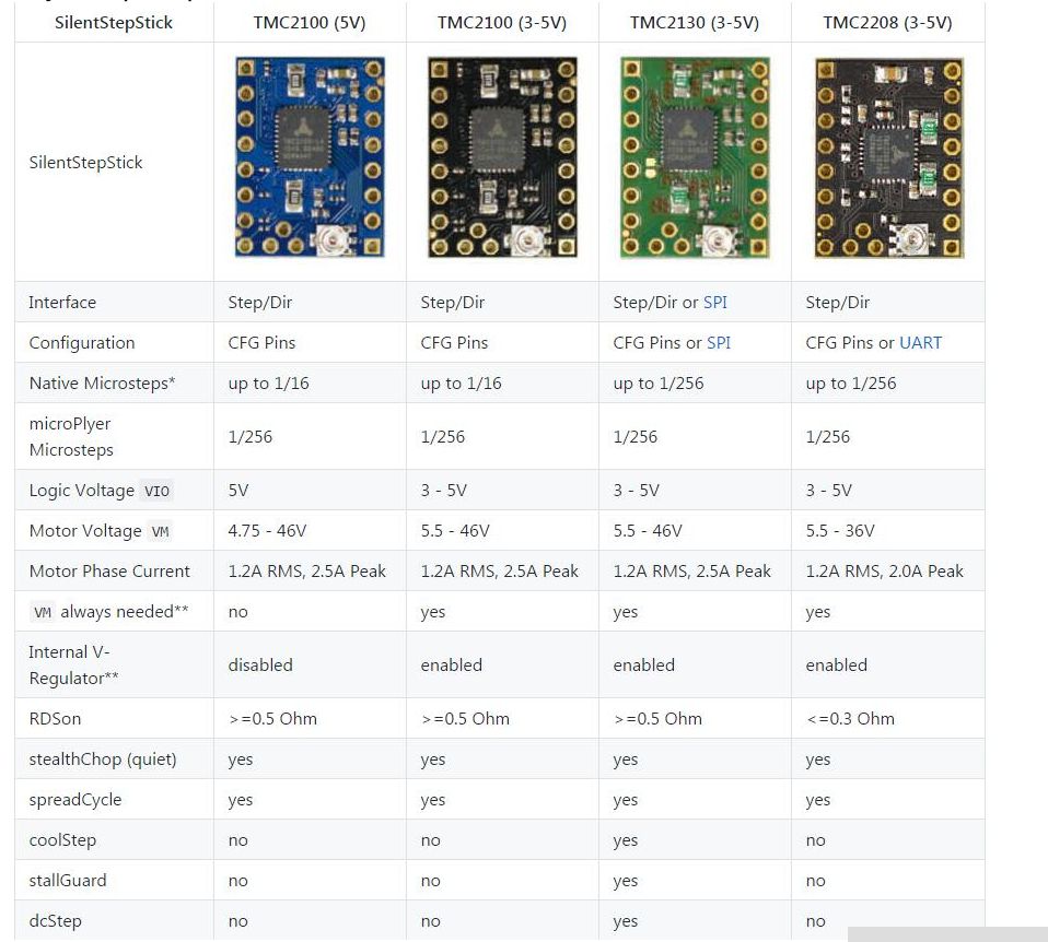 п.с. оказывается вышли версии уже TMC2130 и ТМС2208. чем лучше/хуже? кто нить понимает что в этой таблице, или уже опыт есть?