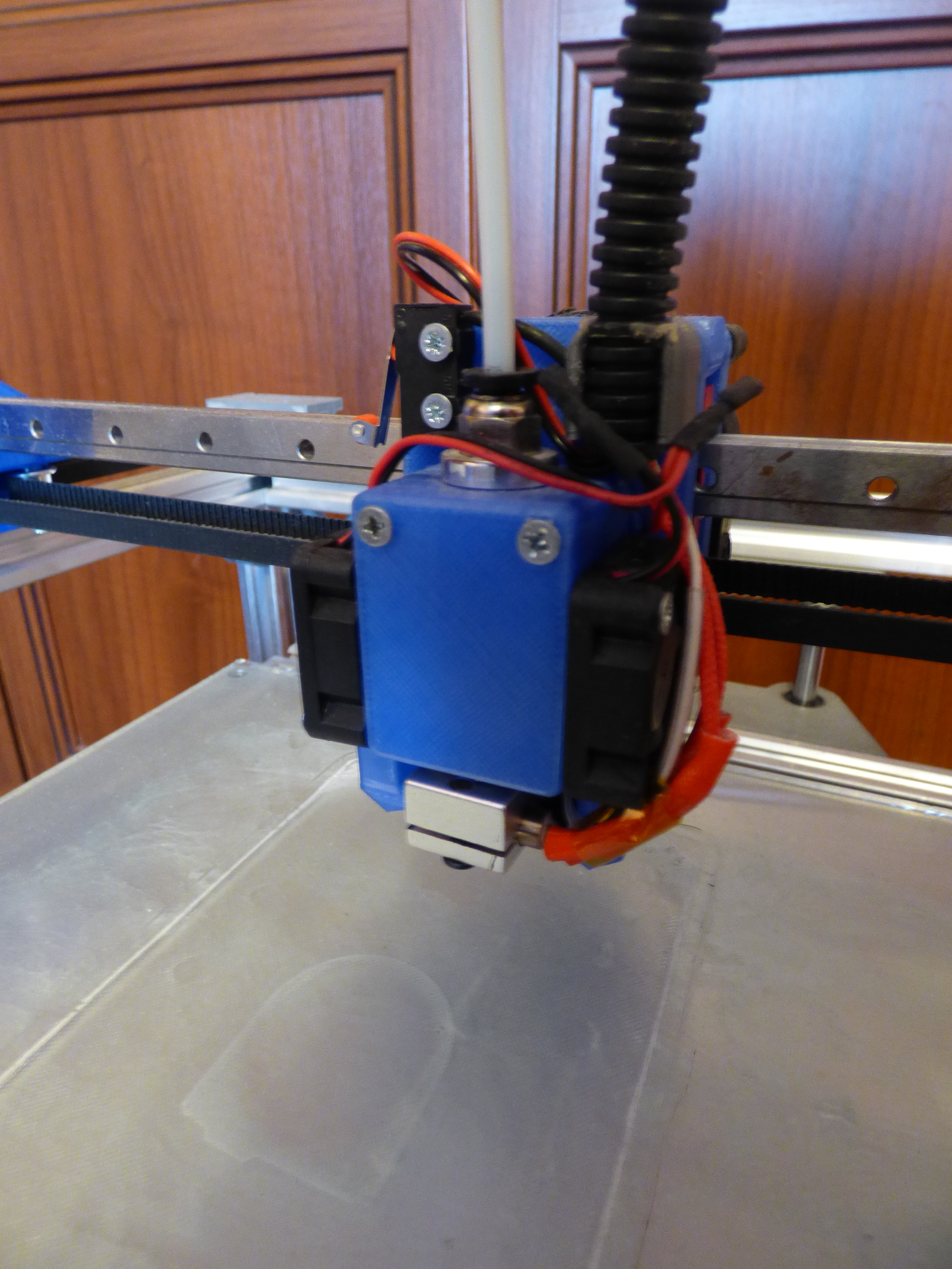 Ось Х собрана на двух 8 мм. круглых валах, длиной 380 мм. От подшипников отказался сразу, ввиду их крайней "поганости", вместо них были установлены медно-графитовые втулки. Одно из спорных решений, которые хотел прогнать на принтере. Как оказалось валы ведут себя на такой длине почти как рельсы. Ко всему прочему они в паре с медно-графитовыми втулками фактически бесшумные, качество печати на вполне достойном уровне. Даже резкая смена направления с ускорениями 3000 и джерком 10 обходится без звона на скорости 100-120 мм/с. Больше пока не пробовал.