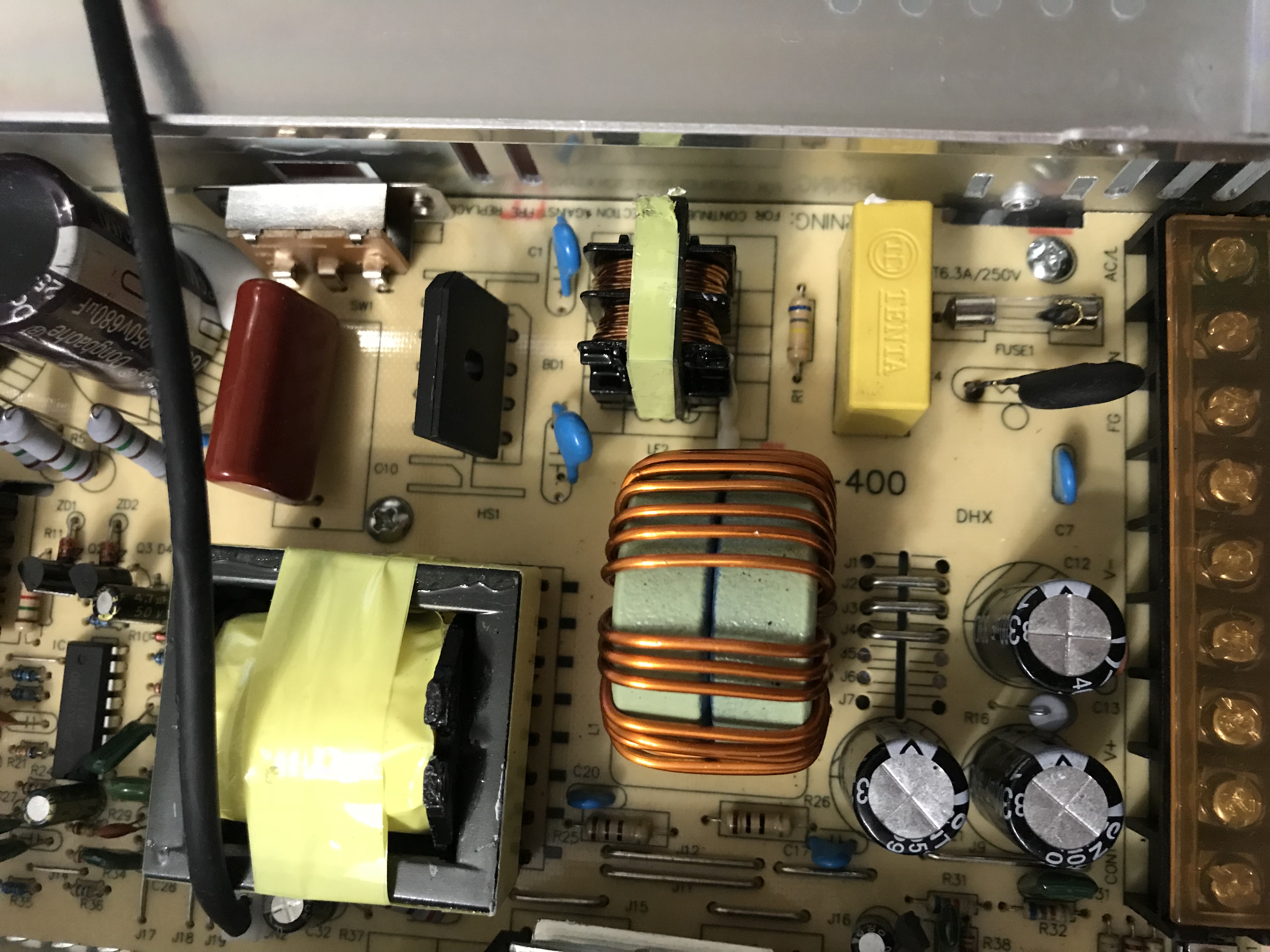 Предохранитель живой, даже на фотке видно, что нитка не сгорела. А эти жуткие следы - от замыкания между корпусом предохранителя и ногой варистора (синенького) Видно у китайца при пробном включении чем-то замкнуло 220В на коротыш, но или выбило "пробки" или благополучно выгорело. Замыкание это было ДО предохранителя. Так что все Ок с блоком питания