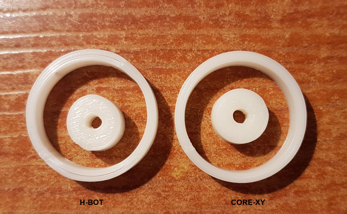 Переделал на CoreXY - стало, практически, идеально. Эксцентриситет, если и есть, то соток 5-7 (на h-bot был почти миллиметр).