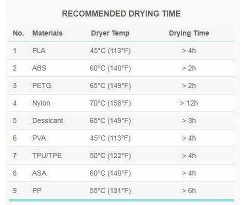 Сушили только петг (этот 2 часа, попались 2 катушки мокрые) и нейлон. Правда нейлон сушили не более 6ч, последний раз 4 часа