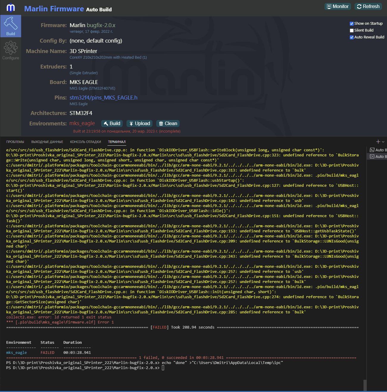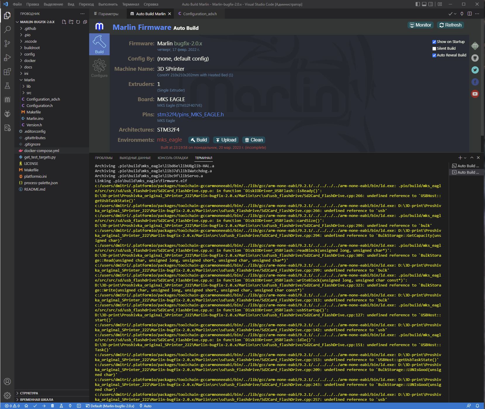 Далее открываю скачанную ранее прошивку Marlin-bugfix-2.0.x для моего принтера (222 на базе MKS Eagle), ничего в ней не меняю и на закладке Auto Build Marlin нажимаю кнопку Build. Процесс пошёл... Но по истечении 2-3 минут я получаю ошибки (скрины прилагаю) и соответственно на выходе ничего...