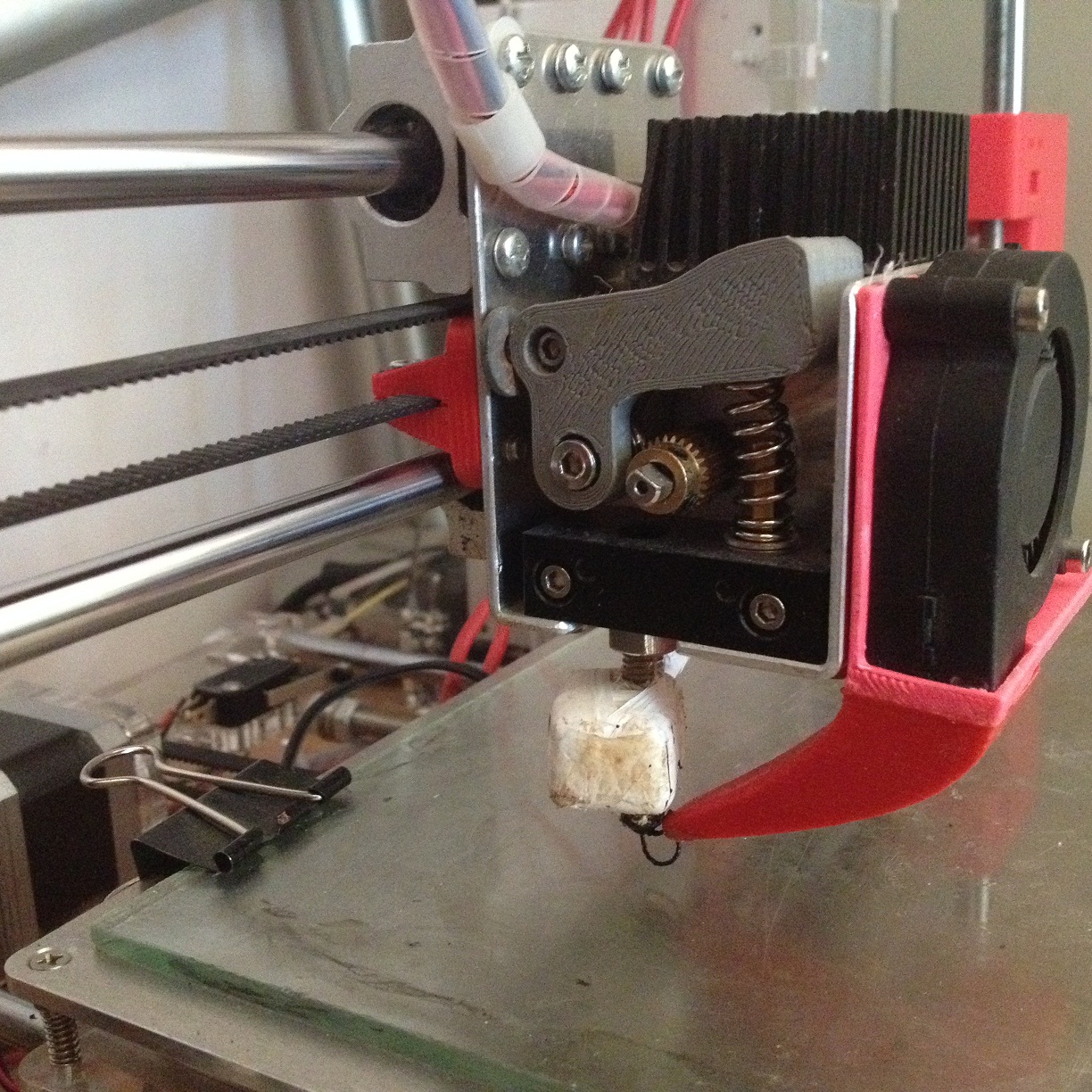 По хотенду. ИМХО, можно так сделать, но не нужно. Потому что по весу и прочности печатная байда будет гораздо хуже уголка. Если уж такие сложности с разметкой и сверлением этого уголка возникают, то могу кернить заготовки. По накернённому-то, думаю, и рёбёнок просверлит. Да и резьбу нарезать с спомощью шуруповёрта, вроде бы, проще простого.