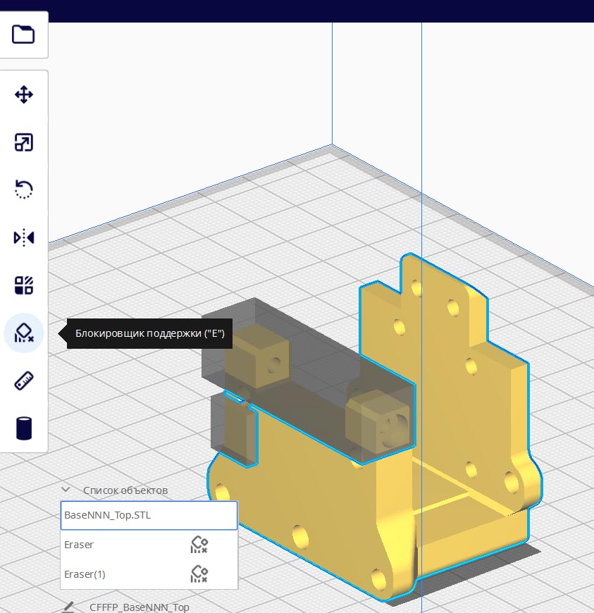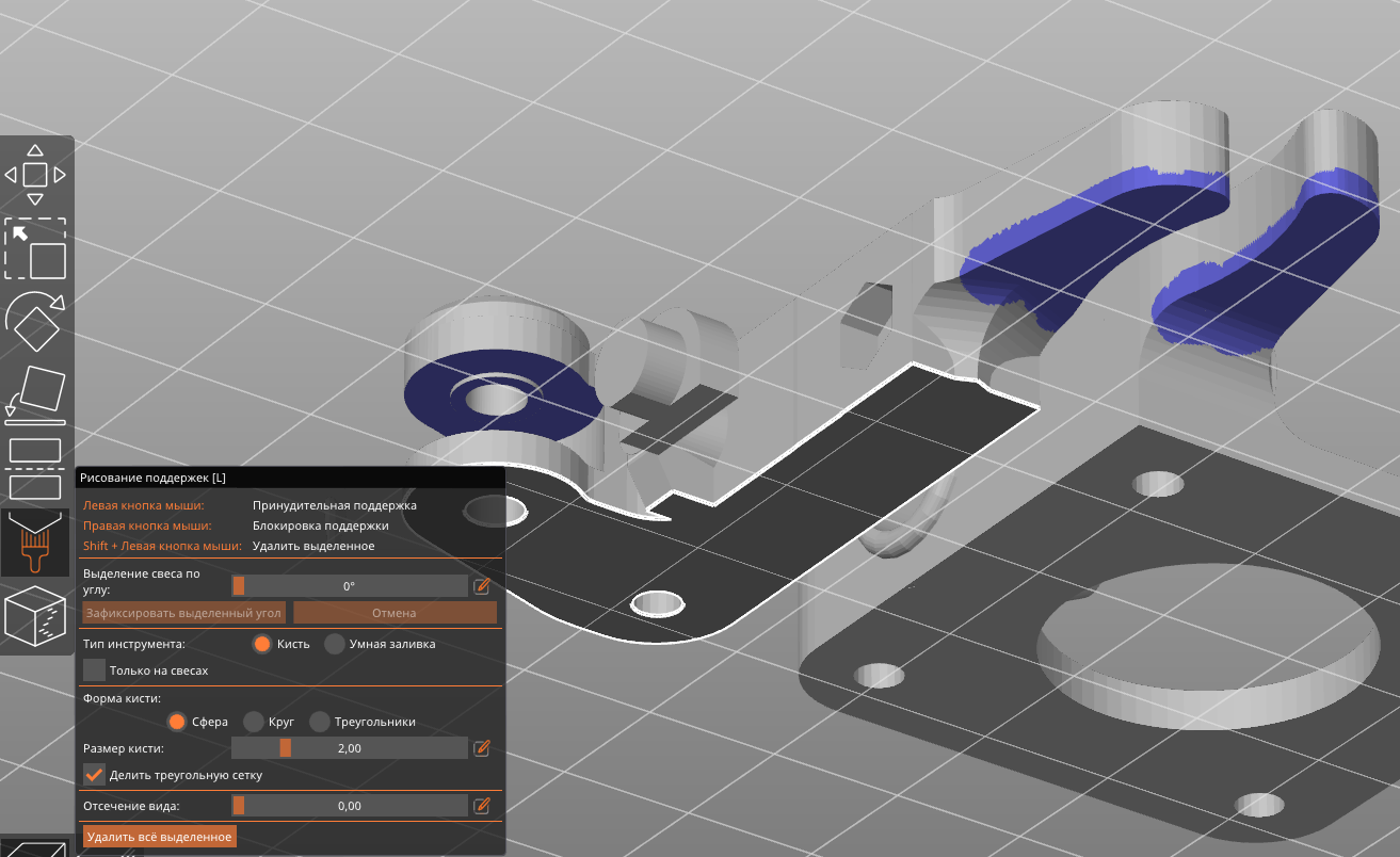 4. Ручное расставление поддержек (о, я смотрю ещё сильно расширили возможности). Кура, например, просто обожает залазить поддержками в тонкие длинные и/или глухие отверстия - потом вытаскивать замучаешься, блокировки неудобные надо расставлять: