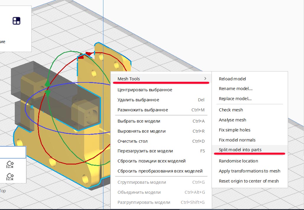 2. Быстрое разрезание сборки из нескольких деталей (Андрей любит выкладывать такие) для печати только одной из частей: