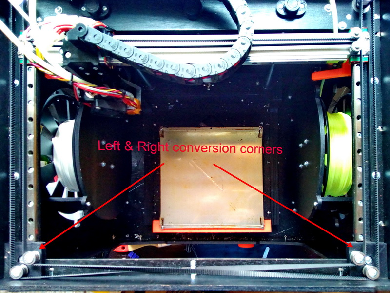 Если вдруг кому то, как мне, захочется переделать H-bot кинематику в Core XY - могу предложить воспользоваться моим "переделочным КИТом". Особенность данного "тюнинга" в том, что он совершенно обратим назад в H-bot и требует минимальных переделок. Я использовал в качестве роликов четыре пары фланцевых F624 подшипников. Чтоб ремни в точке перекрещивания меньше терлись друг об друга, я установил там болт с надетым на него кусочком рассверленной до 3мм тефлоновой трубки. Крепление ремня позволяет натягивать сразу обе "ветки" одинаково. Поэтому при первоначальной установке важно сразу организовать одинаковый натяг веток. При некоторой тренировке это нетрудно :)
