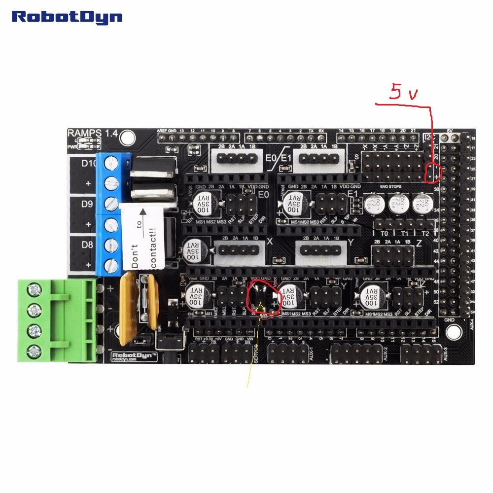 Я просто не знаю, будет ли работать как выше указано, я не пробовал. Я пробовал подавать на + сервов, на ножку в разъеме шаговиков и ставить DC-DC вместо того самого выпаянного диода.