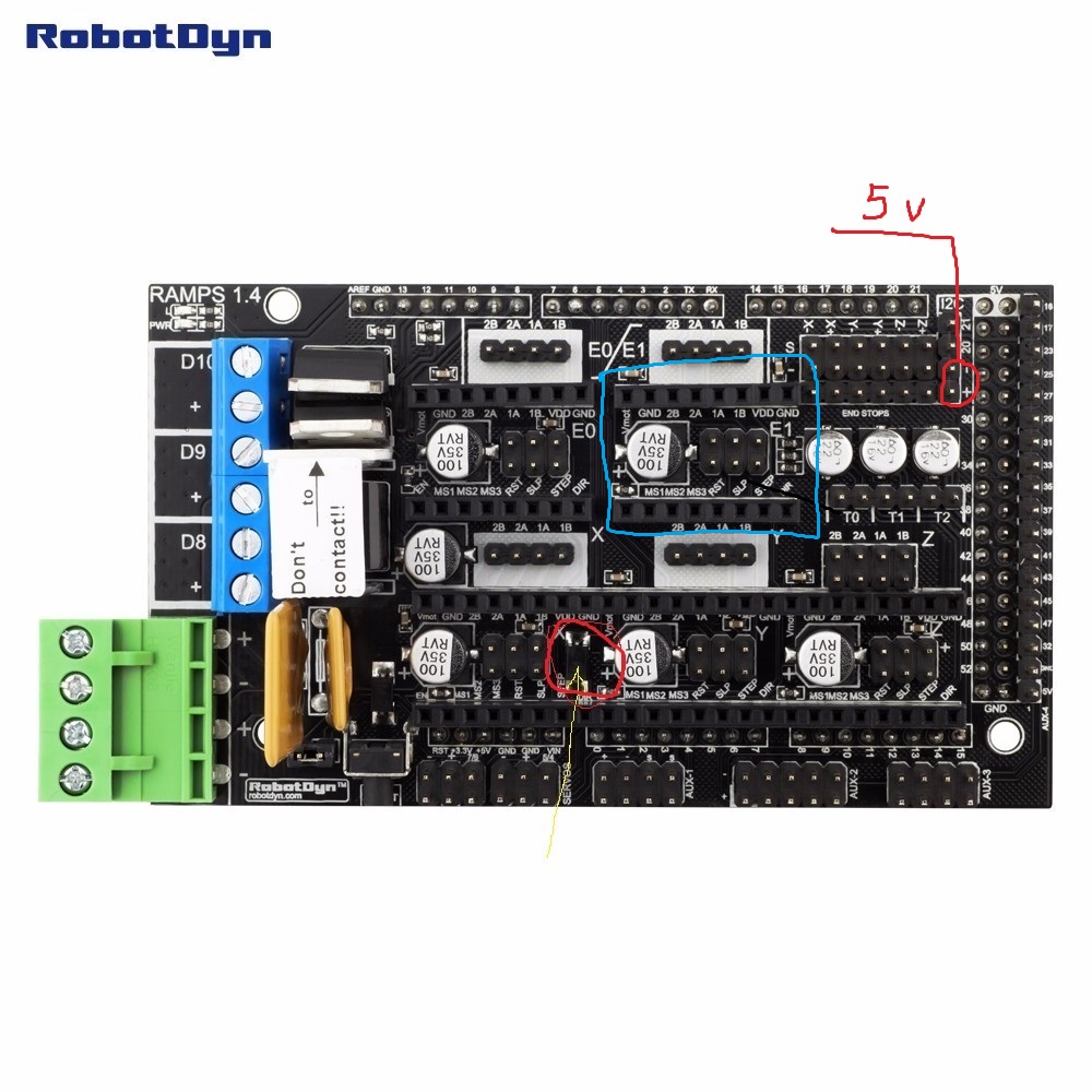 В идеале, если дружите с паяльником, можно сделать платочку, которая вставляется вместо драйвера 2го экструдера, берет питание с ноги Vmot и выдает питание на VDD через какой нить миниатюрный DC-DC. Но это в идеале. А так можно просто на VDD питание подать.