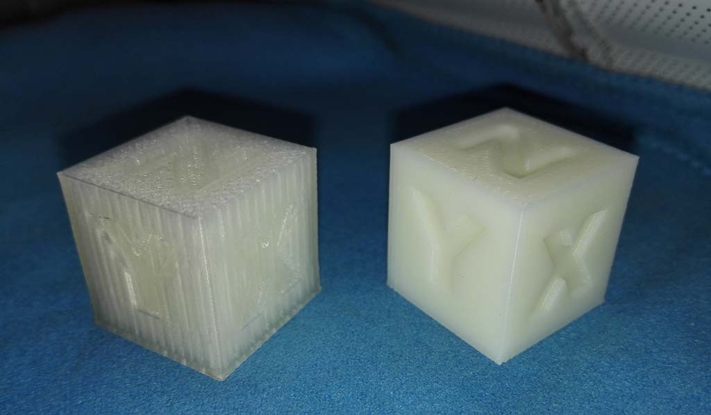А натуральный шершавый... Ну вроде победил его. Хотэнд 245; стол 70; слой 0,1; текучесть 110. Слева PLA. Качество на твердую 4.