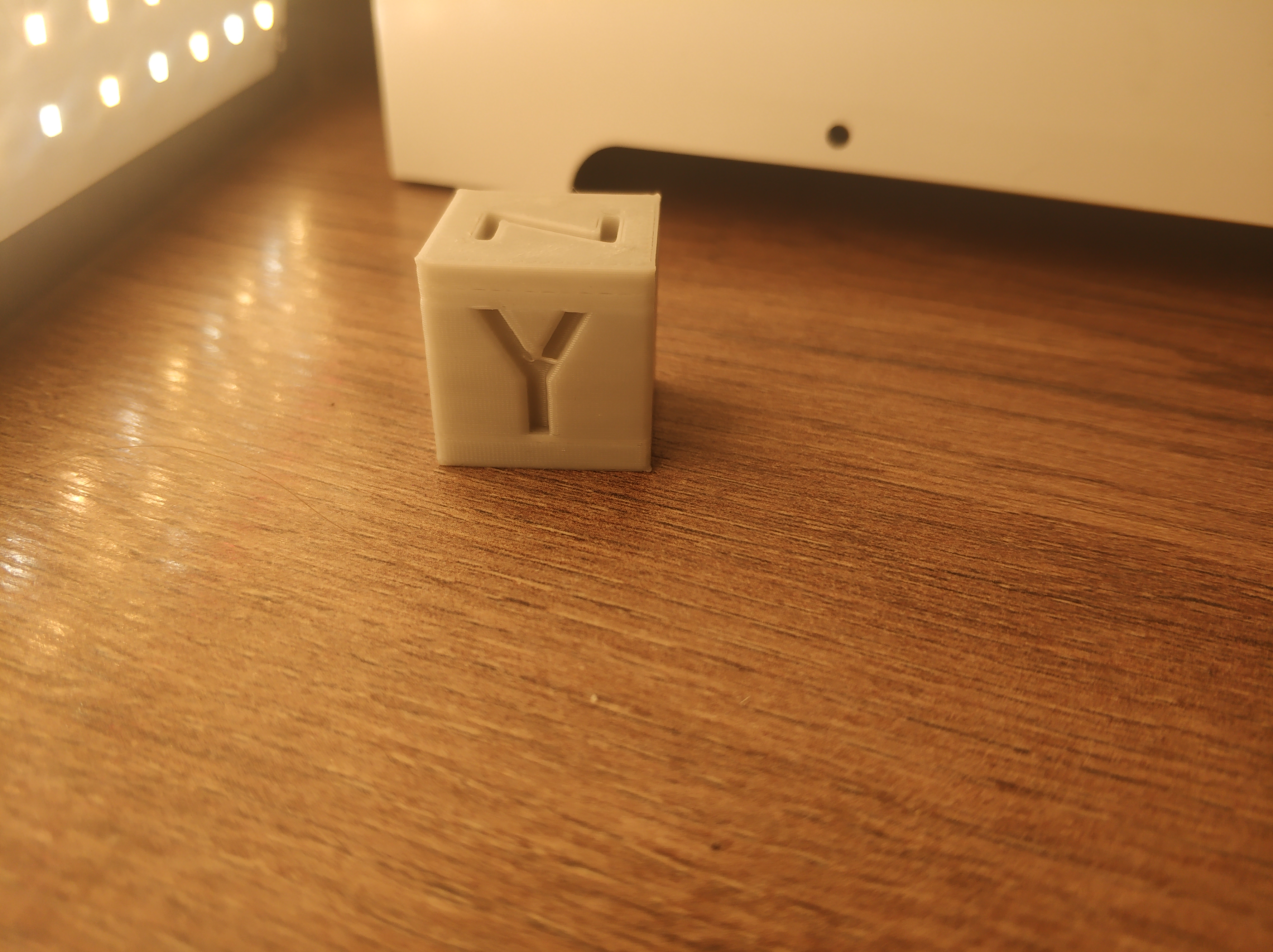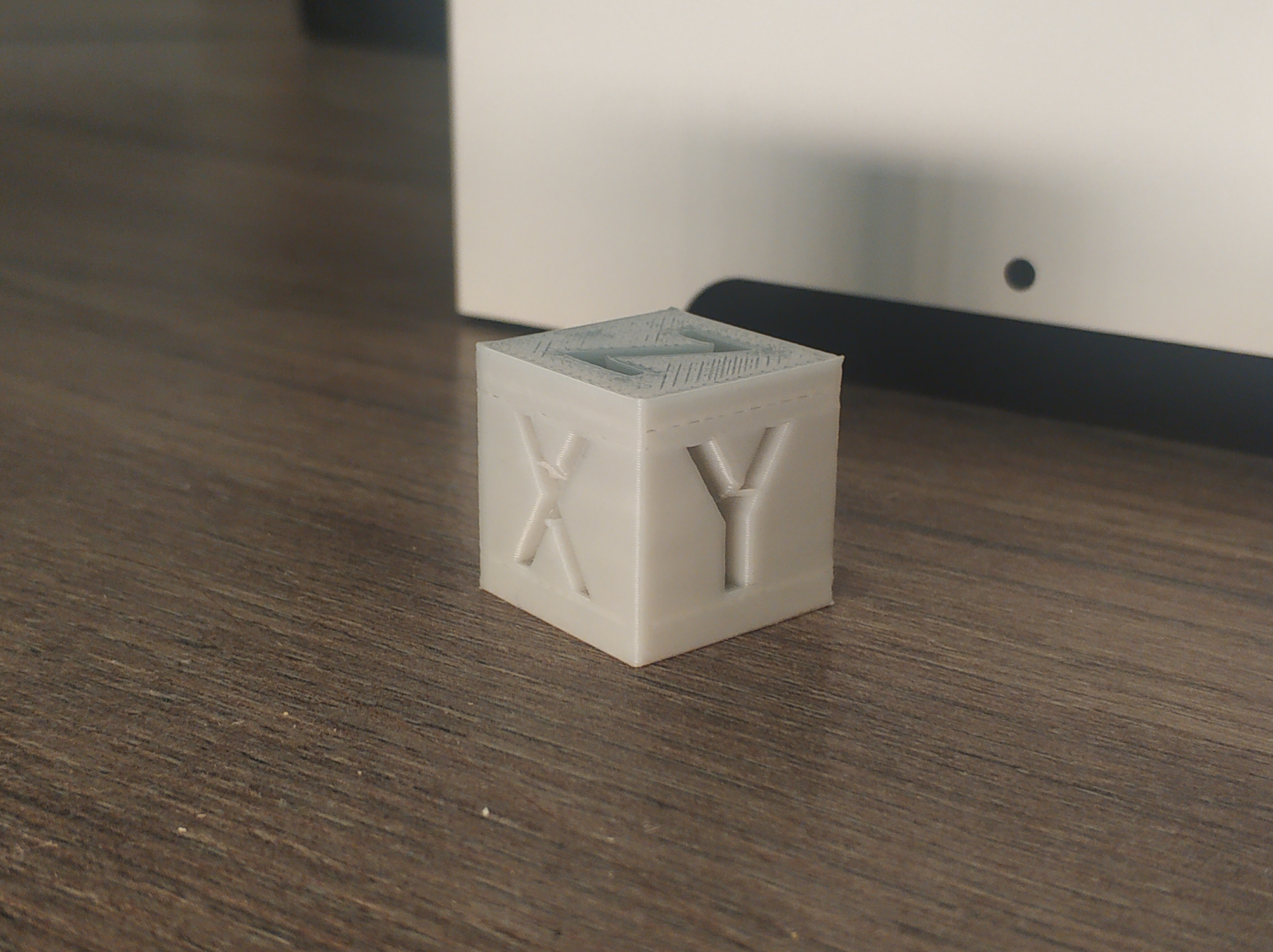 Качество получилось не очень, но понять можно. Сперва всё идёт идеально, потом когда пошло изменение геометрии передней стенки, качество ухудшается и когда начинает печатать три стенки, вообще хлам какой-то