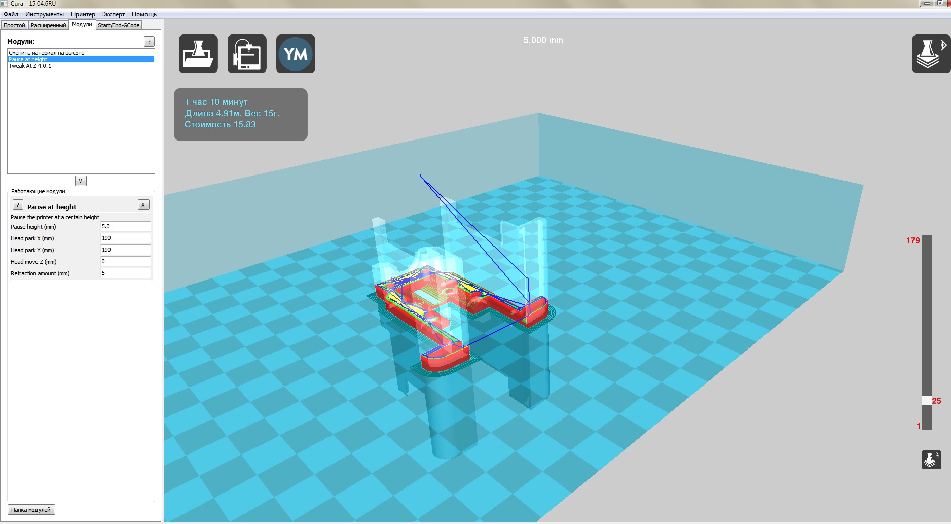 Вот, сымитировал у себя паузу на высоте 5 мм (25-й слой при высоте слоя 0,2):