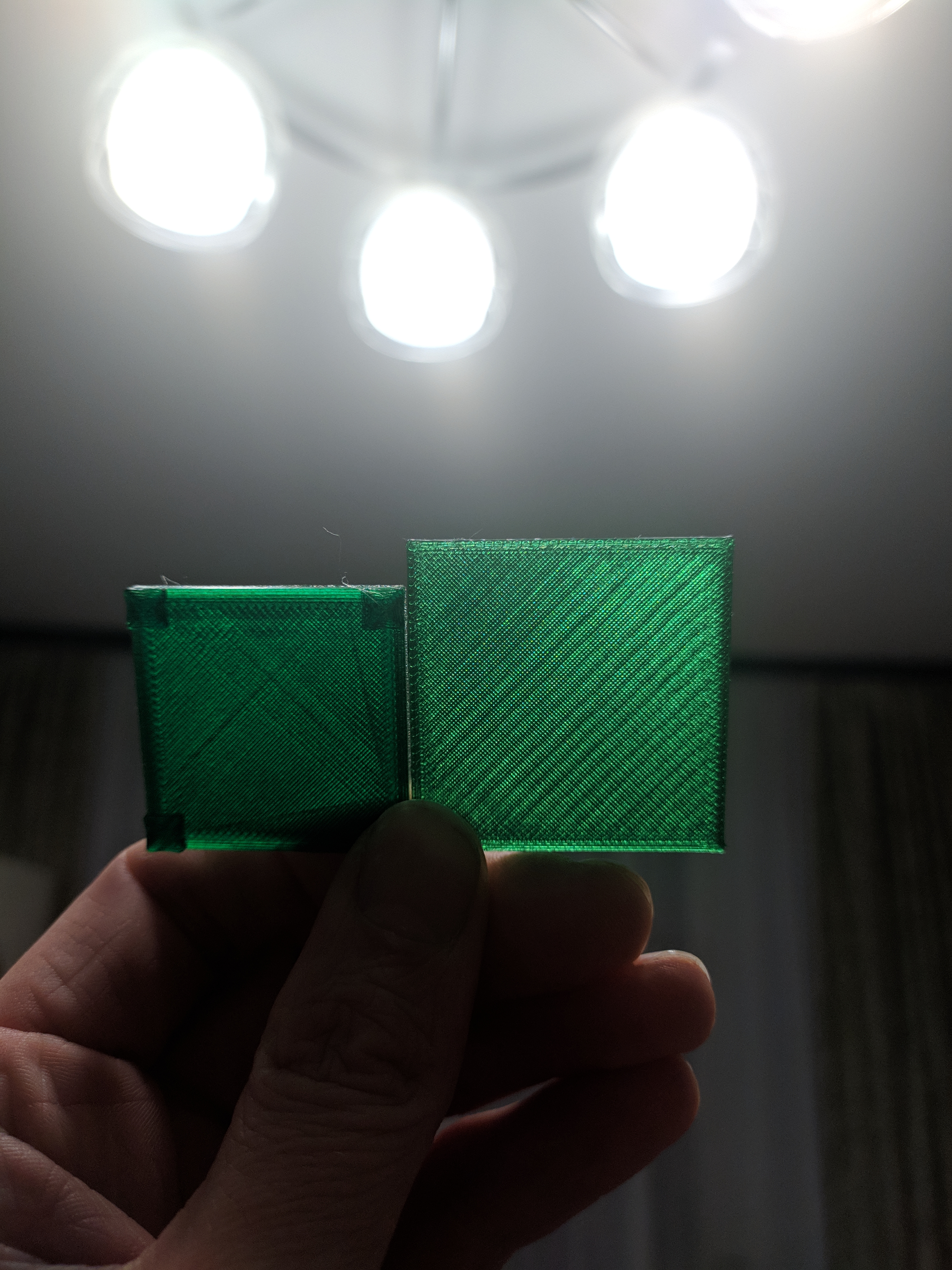 Можно попробовать в разных слайсерах. Тот же ультимейкер на горизонтальном прямоугольнике начинает заполнять плоскость с середины. По диагонали разумеется. Доходит до угла, возвращается опять на середину и наслаивает вторую половину. А вот superslicer от PrusaSliser или как там пишется, рисует от одного угла до другого. В итоге никаких соплей. Особенно это заметно на полупрозрачных пластиках, так как даже если слой верхний ровный, всй равно в глубине видна структура. Одинаковый деталей нет, но для примера сойдёт: