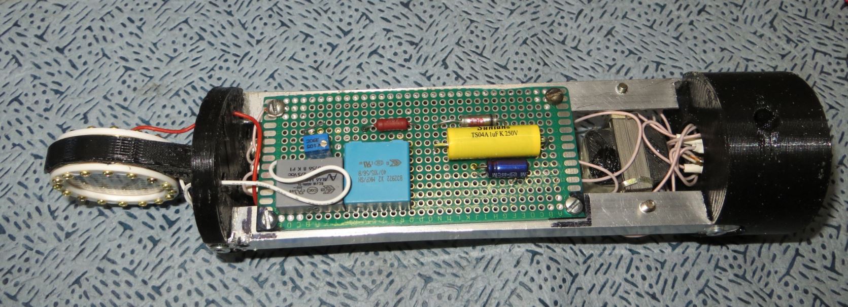 Схему пробовал на трёх напряжениях питания - сейчас работает с напряжением питания 140 вольт. Хотя лампа и рассчитана на напряжения накала 6,3 вольта - пониженное напряжение накала до 5,2 вольта позволяет работать лампе в МИКРОМЕТРИЧЕСКОМ режиме с сеточным резистором 1 гигаом - что очень сильно снижает внутренние шумы микрофона и повышает качество записи звука. Качество звука у данного микрофона получилось очень высокое. Только корпус достаточно сильно нагревается но рука терпит. Единственно кому от этого не очень хорошо -это разделительному электролитическому конденсатору - у него в разы снижается ресурс от работы при температуре 45 градусов (а не при комнатной температуре).