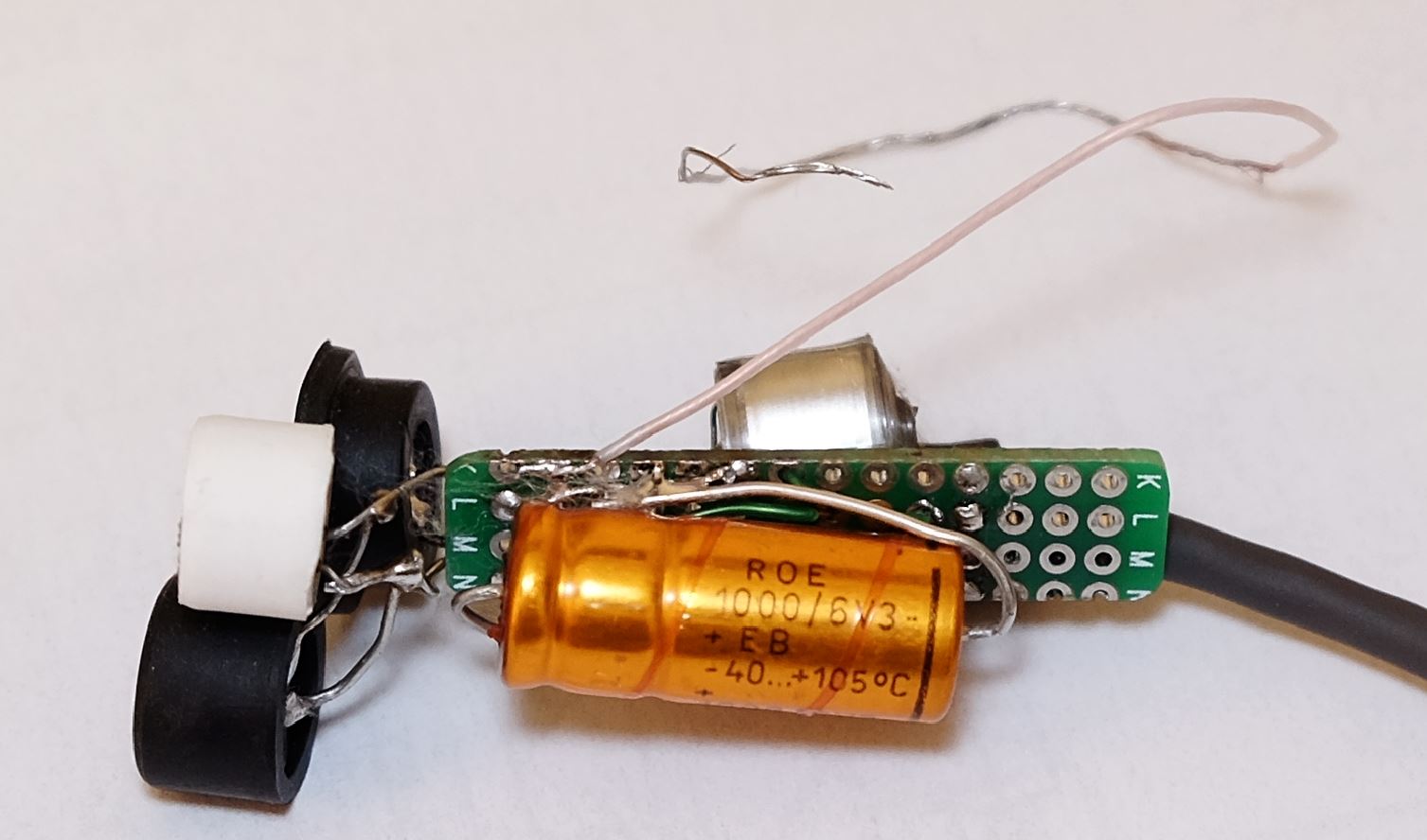 Капсюль 1991 г.в. - то есть электретный заряд мембраны сильно уменьшился, поэтому подключено напряжение поляризации. Звук получился сильно лучше, чем был до того как разломал капсюль и лучше, чем этот капсюль играл с микрофонным транзисторным предусилителем на фантомном питании 48 вольт.