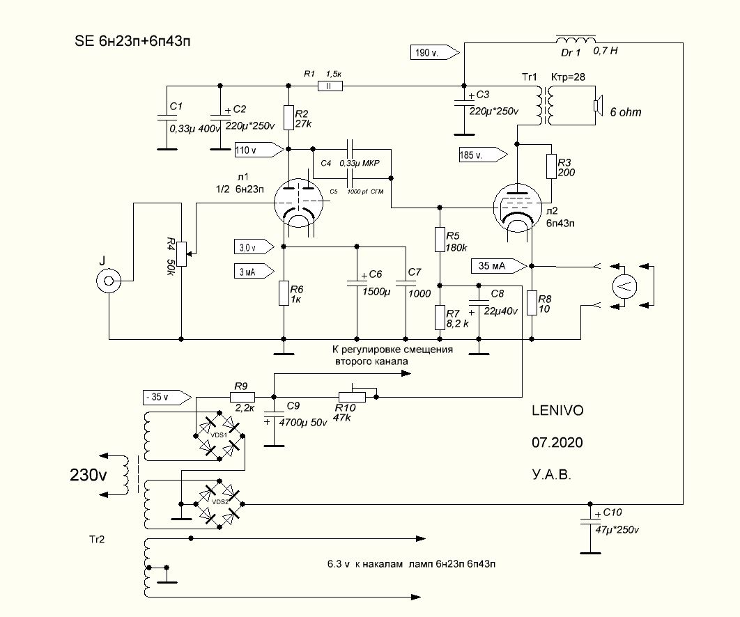 Схема однотактного лампового усилителя SE 6н8с+6п6с