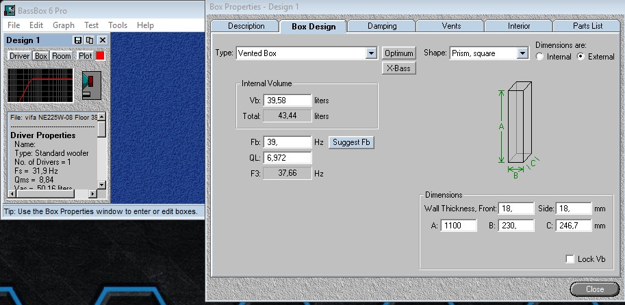 Думал ошибка, но давайте тупо внешние размеры перемножим в дециметрах и получим 5.4 х 2.6 х 3.16 = 44.3664 л. Отсюда можно сделать вывод, что БассБокс частенько косячит с расчётом объёма, и его надо вручную проверять. При Vas=50.16 40 литров это идеальный объём, чтобы немного "подпереть" динамик по Qms. Дальше "вата" в звук добавляется. Ну и максимум без "ваты" можно до 50 литров увеличивать, а это ни то ни сё для напольников получается. Проверил генератором https://www.loudsound.ru/generator/, они в полочном варианте от 30 легко играют. Решил оставить, как есть.