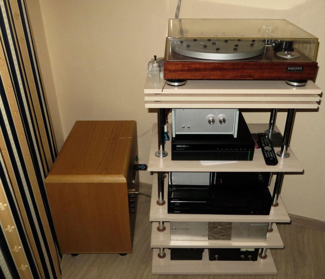 Потом добавил рупорные супертвитеры и гармонизаторы звука - просто положил на полку рядом с колонками. Также добавил саб - он играет ниже 50 гц и тянет до 12 ГЦ (хотя сам ниже 26 ГЦ не слышу). Саб REL STADUIM III.