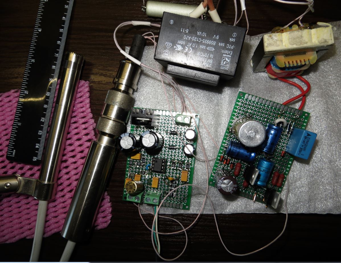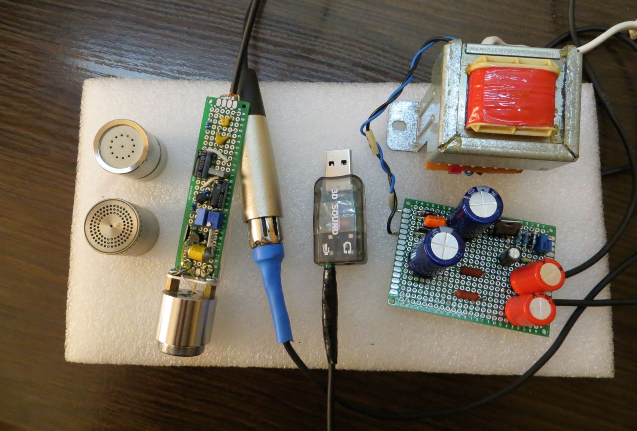 Вот так выглядит вместе с самодельным блоком фантомного питания и дешёвой карточкой для оцифровки звука. Эта карточка очень не плоха и имеет очень низкий уровень своих шумов.