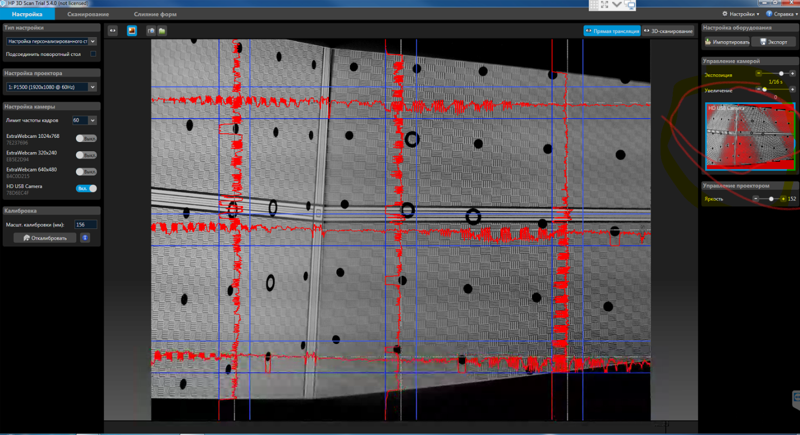 Не могу выбрать почему то экспозицию 1/60, есть только 1/64 откуда то. На больших разрешениях фпс мало. Переключится на mjpg так же не позволяет. Калибруется так же через раз. Очень трудно сфокусироваться, надо другую оптику брать какую не могу понять. Планирую сканировать достаточно крупные объекты.