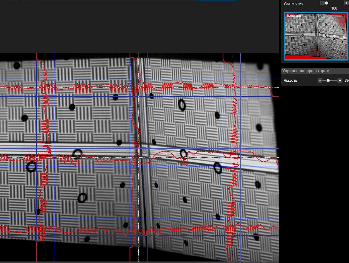 Это фото уже с расстроенной системой, на нем я хотел показать повышенный уровень шума. Когда делал калибровку и пробное сканирование, проектор был настроен аналогично камере и захватывал всю зону калибровочной панели. Но при освещении проектором всей панели все равно складывается ощущение, что камере не хватает света. Если посмотреть например видео оригинального Davida SLS-2 там при сканировании детали, область которую видит камера вместе со сканируемой деталью очень чистая с четкой картинкой и без посторонних шумов.