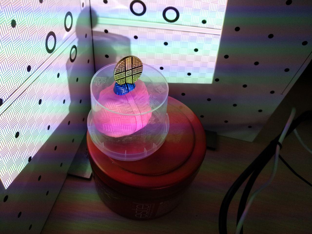 Поставил линзу перед проектором (самую обычную, от "третьей руки"). Удалось подобрать более менее приемлемое расстояние, чтобы я смог сфокусироваться на обычной дистанции 250-300мм. А далее, сделал скан двумя камерами без калибровки (точнее, калибровка была сделана ранее, без линзы и по крупной 50мм таблице). Одна камера такого не пережила бы (искажения формы просто дикие), а вот композитный режим переварил, и очень даже классно. Видео позже выложу. А пока немножко картинок: